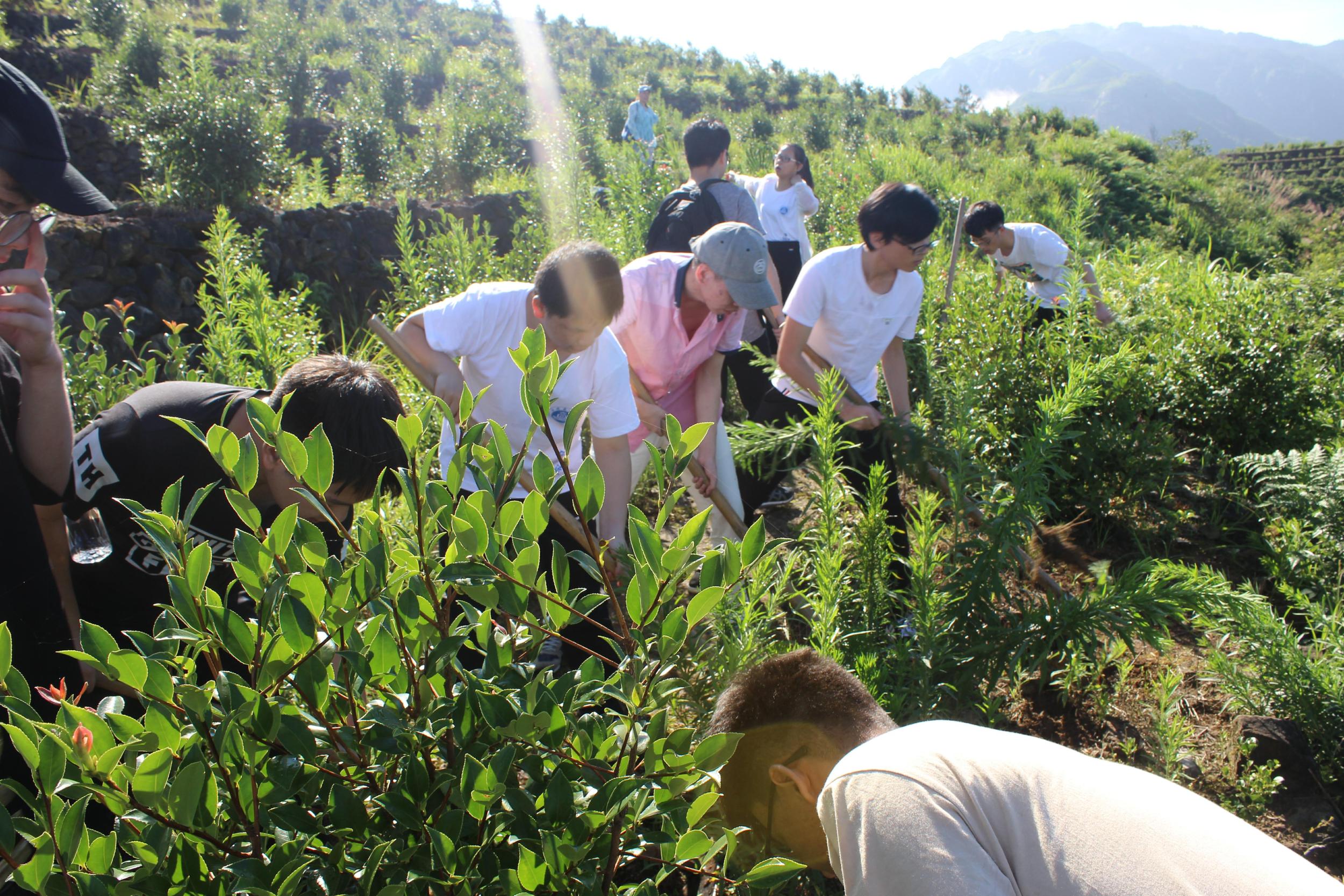 农耕组的任务主要包括茶油基地松土锄草、绿化带清理、水电插秧等,队员们天蒙蒙亮就得出发,有的需要来回徒步2个多小时,从未干过重活的他们,回来后一手的血茧、水泡。他们真正体验着日出而作、日落而息的生活,理解着中国传统的农耕文化。