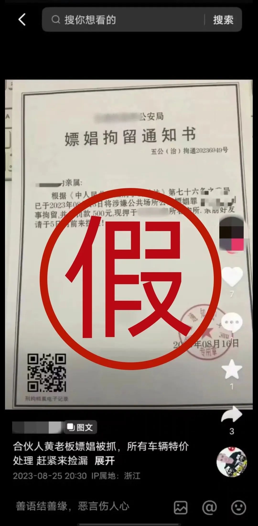 近日,有平阳网友在互联网平台上用账号“贰佰五”发布消息称:“合伙人黄老板嫖娼被抓,所有车辆特价处理,赶紧来捡漏”,并配图一张盖有“公安局样式公章”的文书《嫖娼拘留通知书》。经温州辟谣侠向平阳县网信办、平阳县公安局核实确认,上述系不实信息。