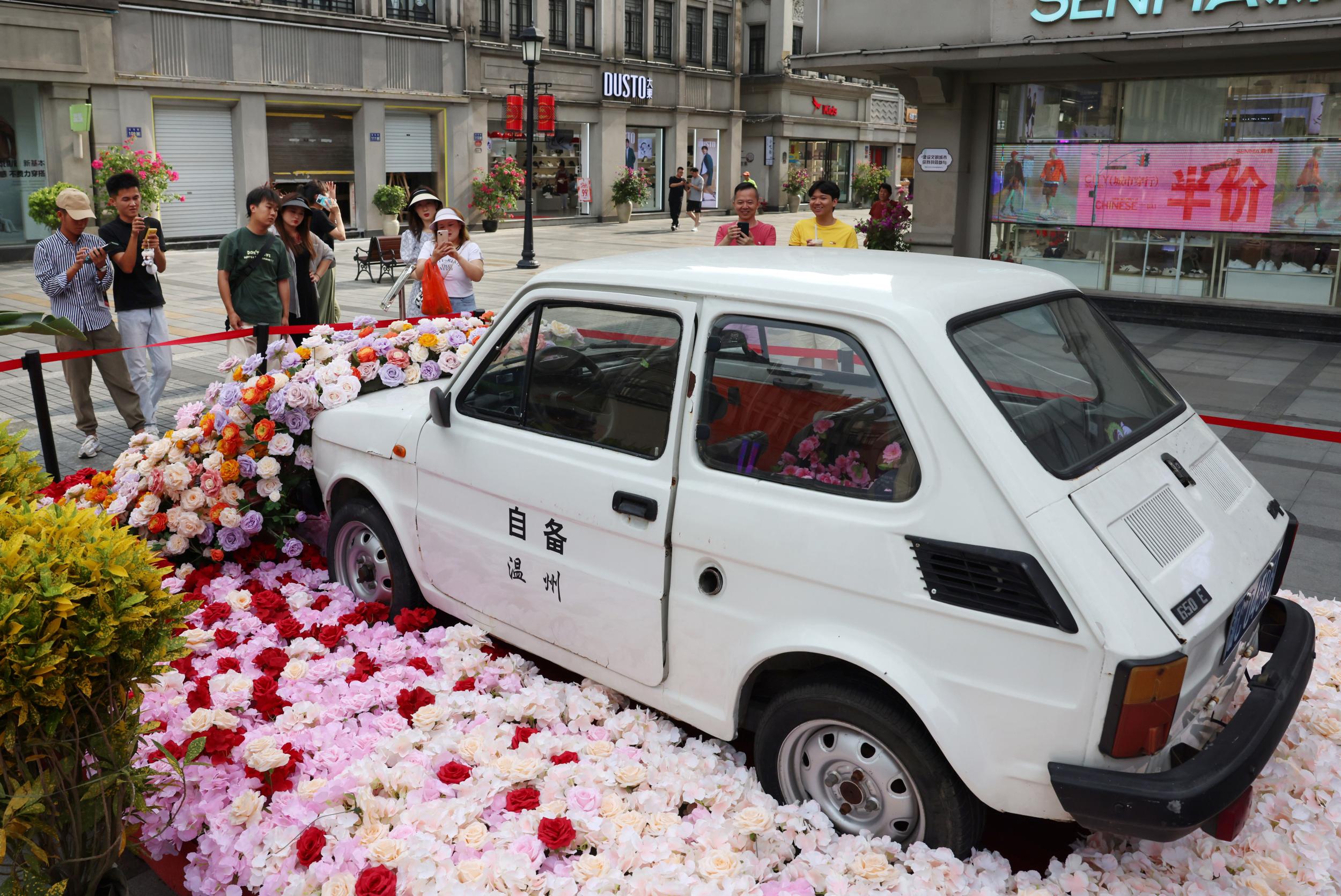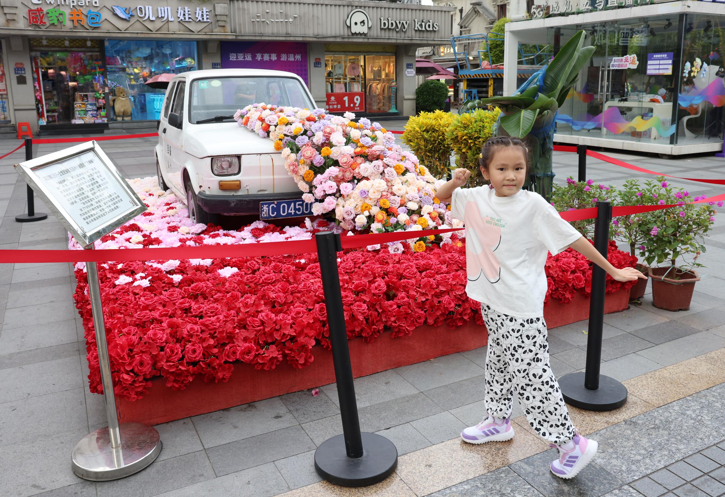 9月12日,温州市五马街,一辆盛装打扮的“菲亚特”在五马小广场展示,吸引着许多市民观看。