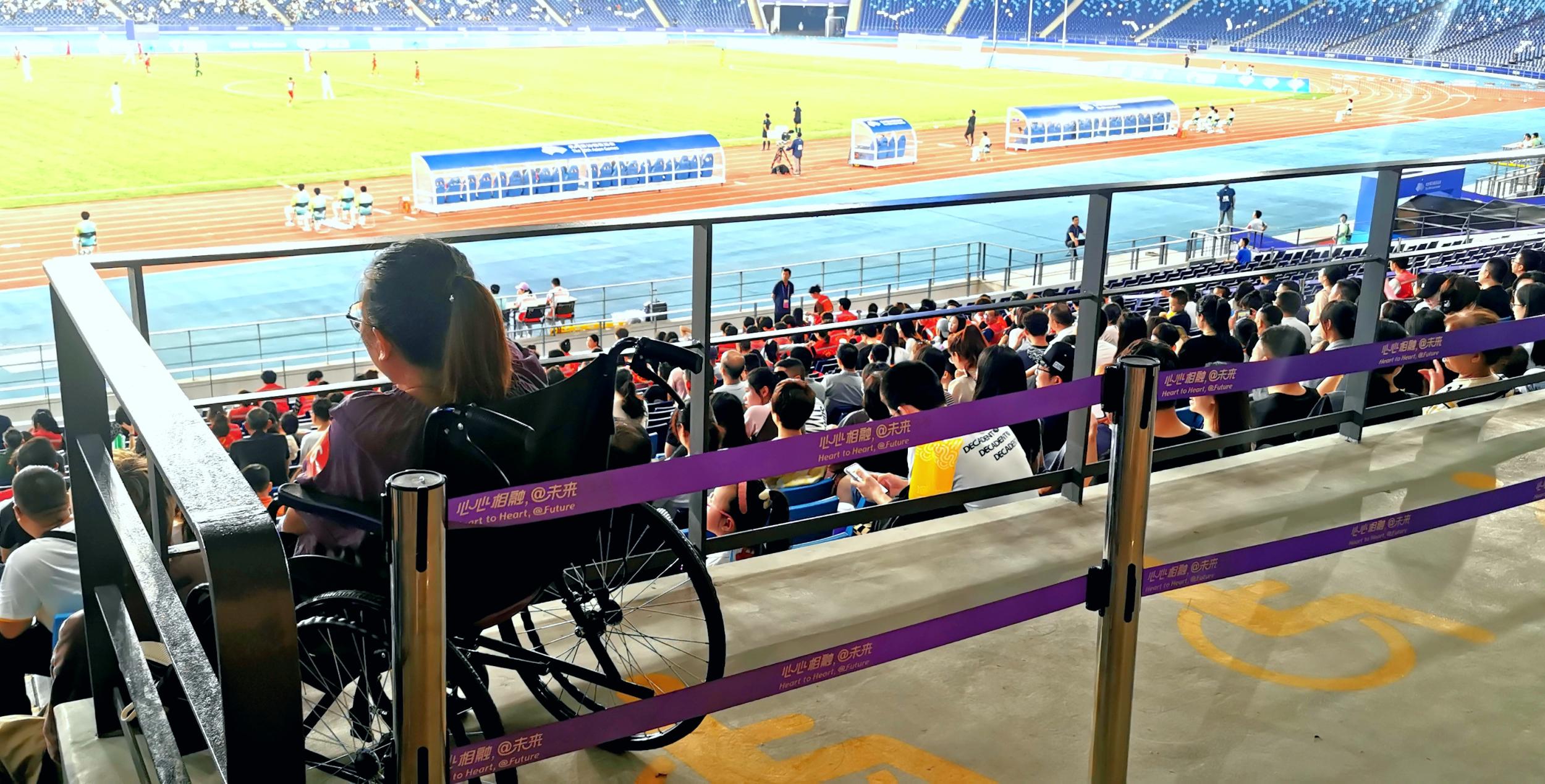 在尼泊尔队对战日本队时,记者在场内看到了一位特殊的观众——她坐在轮椅上,在场内的轮椅区域内安心观赏比赛。在征得同意后,记者采访了这位观众徐女士。她告诉记者,自己就住在奥体中心附近。“我知道自己家门口开亚运会,虽然行动不便,但还是很想亲身来体验下赛事的氛围。”
