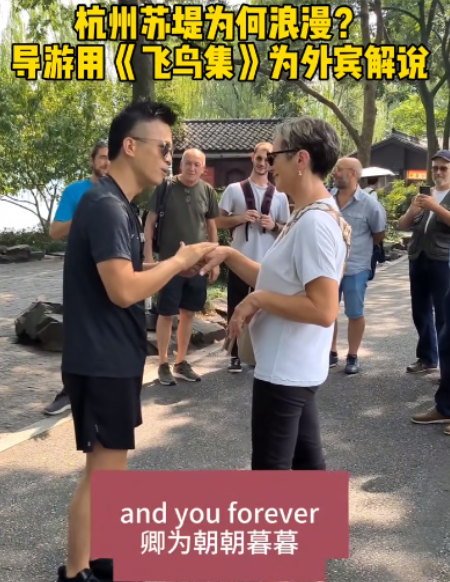 “我说的是英语,再由他们之中懂英语的小伙子翻译成意大利文,我感觉讲解的时候越简单直白越有效果。当时大家听得津津有味,互动的女士也很高兴。”在徐朱成看来,中文往往唯美又博大精深,如果生硬翻译反而适得其反,借用飞鸟集中的诗句营造的故事感,更能让他们身临其境地感受、更好地共情这份苏堤独有的浪漫。