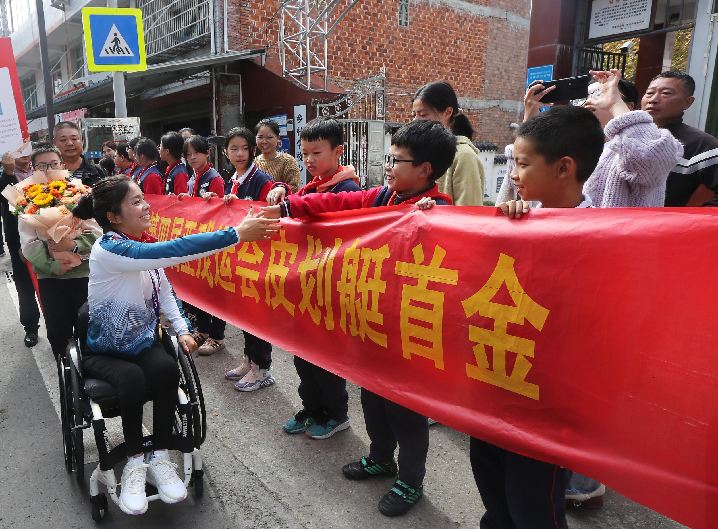 敲起锣鼓、扯起条幅、挥舞国旗……11月8日上午,杭州第四届亚洲残疾人运动会首金获得者谢毛三回到泰顺家乡泗溪镇坑头村,受到了乡亲们的热烈欢迎,一路看家乡新貌,畅叙乡情。