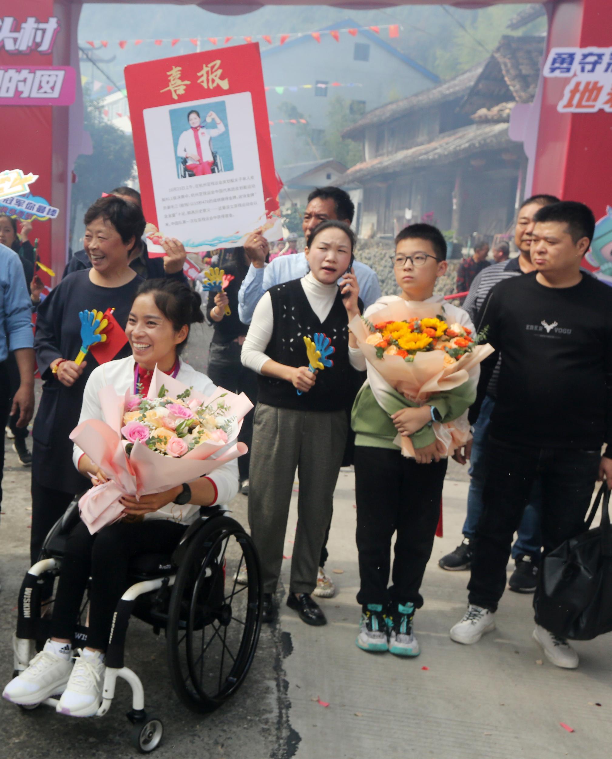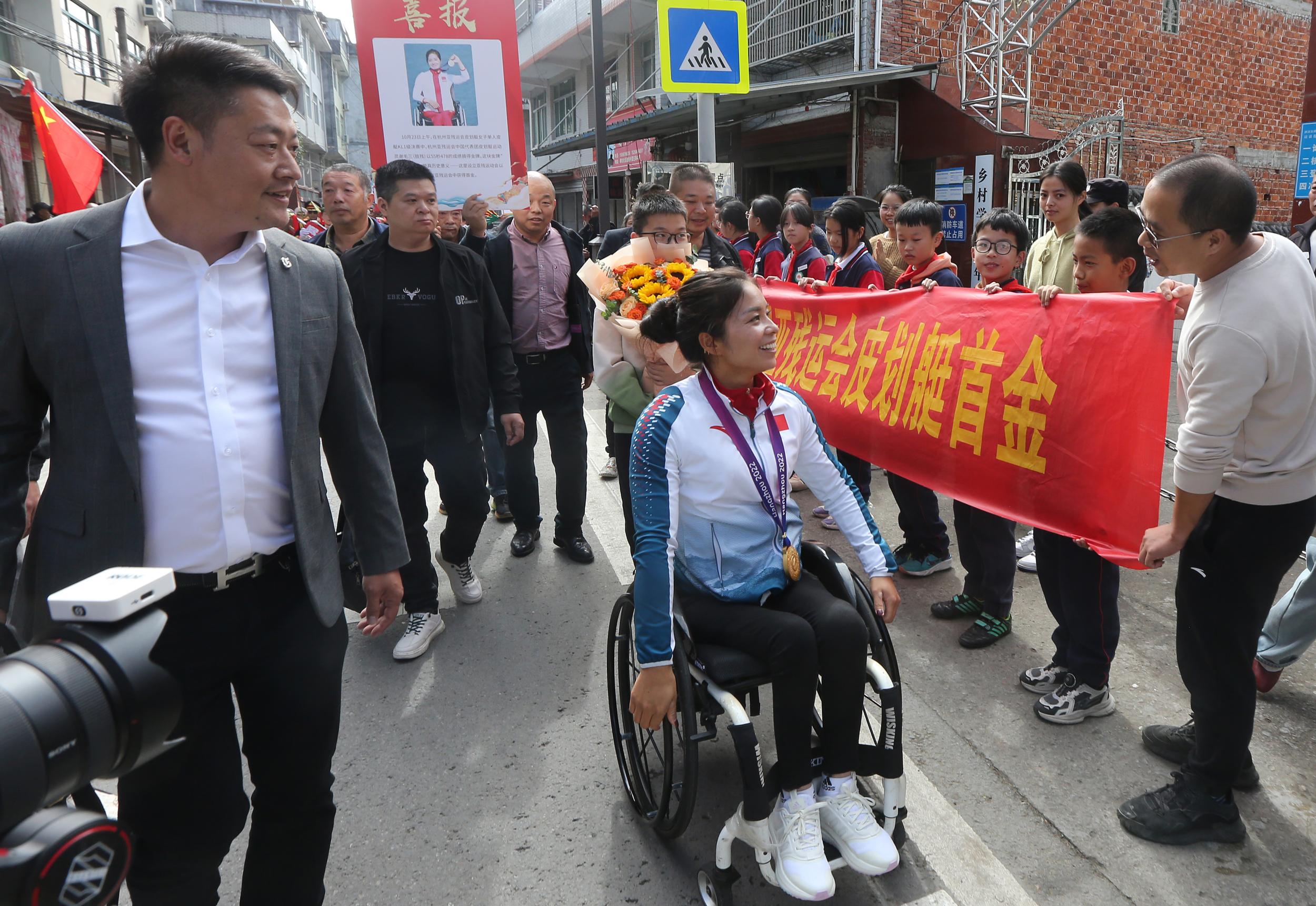 消息传回后,家乡人民欢欣鼓舞、倍感振奋。11月8日上午,伴随着鲜花和掌声,谢毛三终于回到了家乡,乡亲们纷纷前来道喜,推着轮椅陪伴她从泗溪镇建新村回到坑头村的家中,大家用自己的方式表达着对亚残运会首金获得者的祝福。