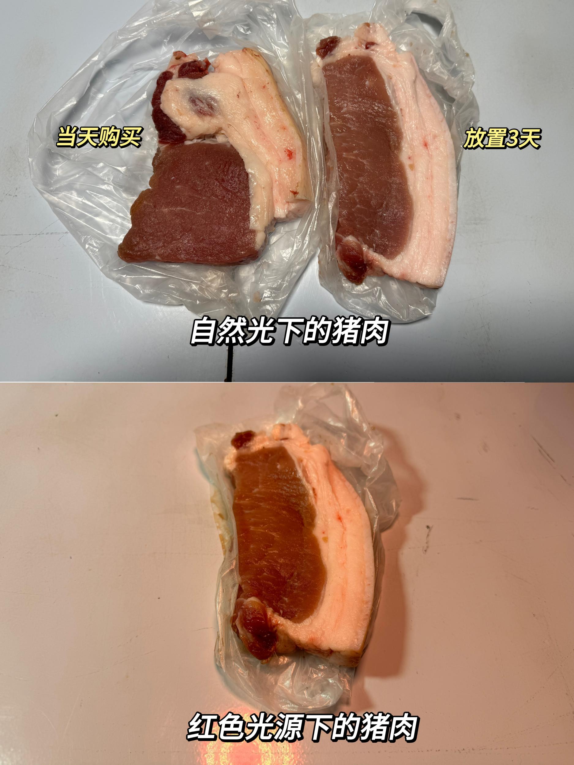而当把颜色不那么鲜艳的猪肉在红色光源的“滤镜”下,看起来新鲜诱人,甚至比自然光下的新鲜猪肉看起来还要鲜亮。