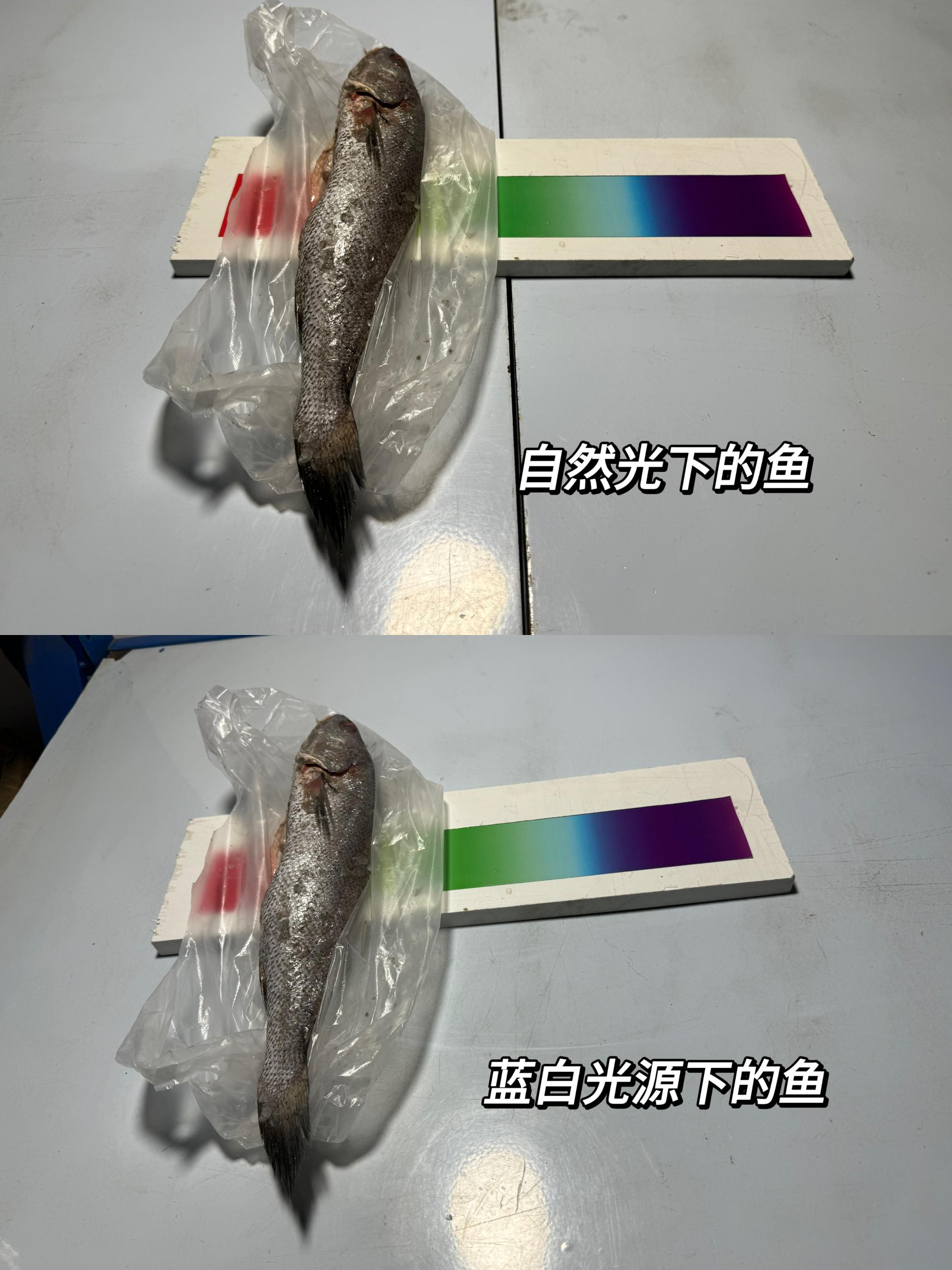 最后,进行的是蓝白色光源实验。同样采用色卡与食物一同实验。已经放置3天的鱼,已经闻到明显臭味,在自然光下和用符合标准的照明灯下,鱼和色卡上的蓝色也没有明显颜色变化。但放在蓝白色的光源下时,鱼身的颜色顿时鲜艳了不少,原本色卡上蓝色也艳丽了很多。