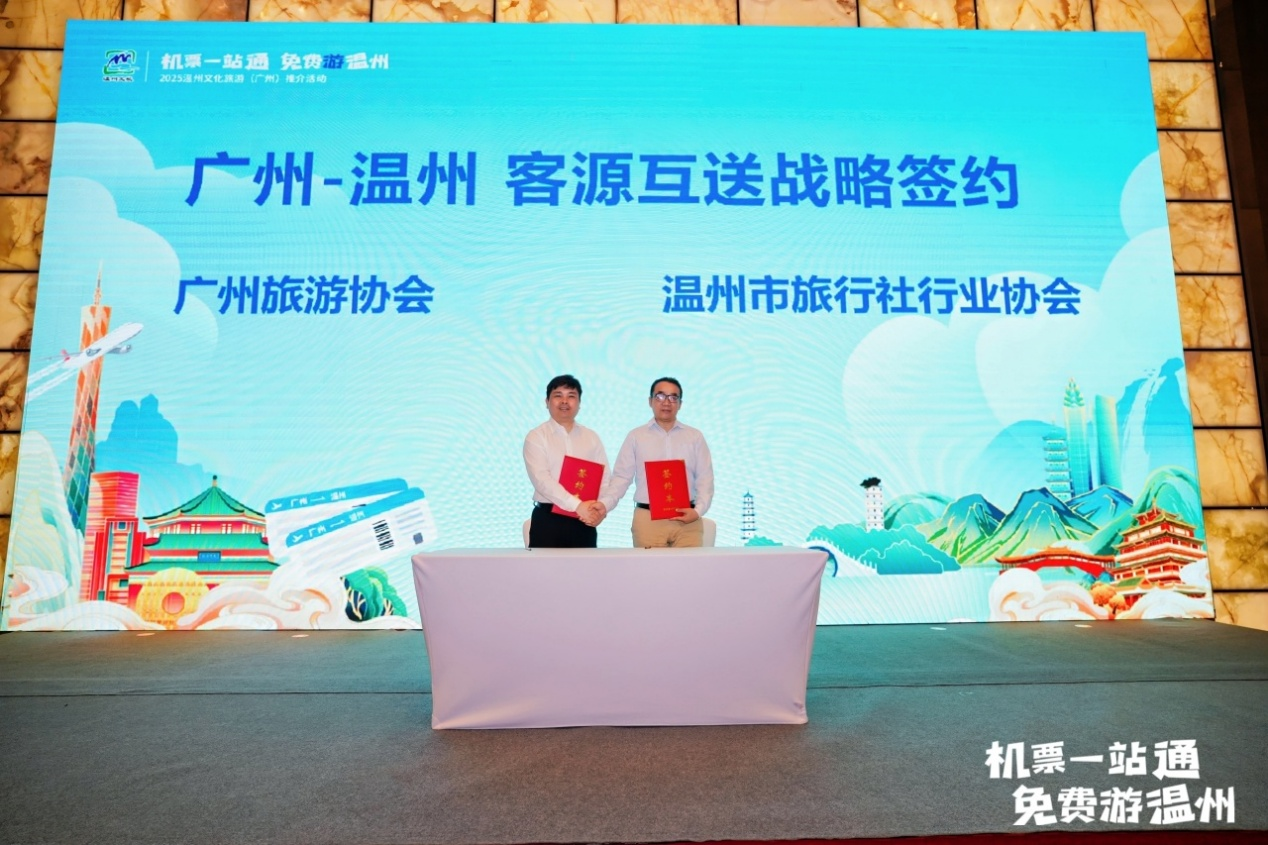 为激发市场活力,温州市文化广电旅游局联动各县(市、区)文旅主管部门,针对旅行社推出梯度奖励机制,涵盖大型团队接待、疗休养团队组织及市场推广等多元化场景。现场举行了“机票一站通 免费游温州”签约仪式,广州旅游协会与温州旅行社行业协会就客源互送达成战略合作。