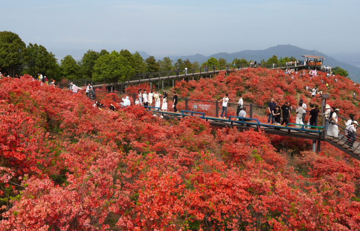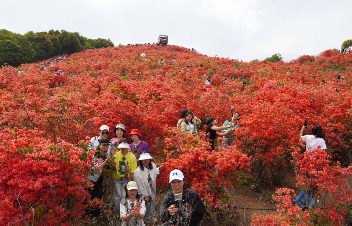 4月16日,瑞安市马屿圣井山,众多游客正在花海里赏花打卡,感受红色高山杜鹃花海的魅力。连日来,马屿圣井山迎来一年一度的杜鹃花期,千亩杜鹃花绚丽绽放,将山峦装点得美不胜收,吸引大批游客前来打卡。据介绍,今年瑞安马屿当地气候条件适宜,杜鹃花开得格外灿烂,预计花期将持续到4月底。随着花海进入最佳观赏期,圣井山游客接待量激增,每日游客量超6000人次,预计周末将达8000人次以上。圣井山海拔748.6米,拥有1500多亩杜鹃花海,品种以红色“映山红”为主。