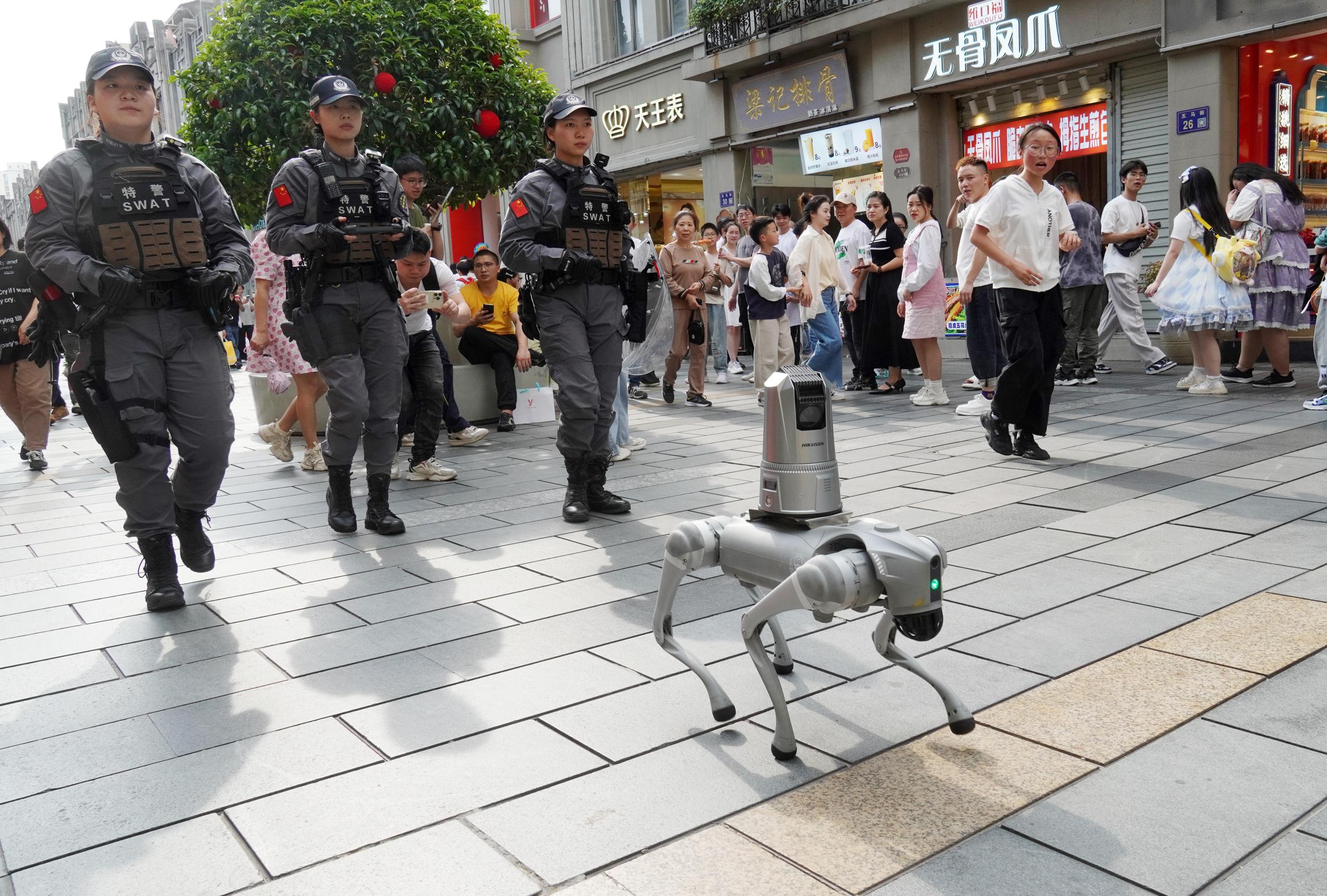 5月1日,温州市区五马街,鹿城特巡警大队的警员携带“机器警犬”巡护街区,开展“人机协同”的安全巡逻模式。