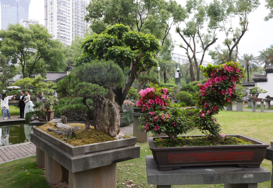 5月17日,五月的温州市区马鞍池公园盆景园里,经过一个多月的精心养护,园内三月底换盆的所有濒危盆景已经全部萌发新芽,其中还有不少曾在全国盆景展摘金的盆景老桩。