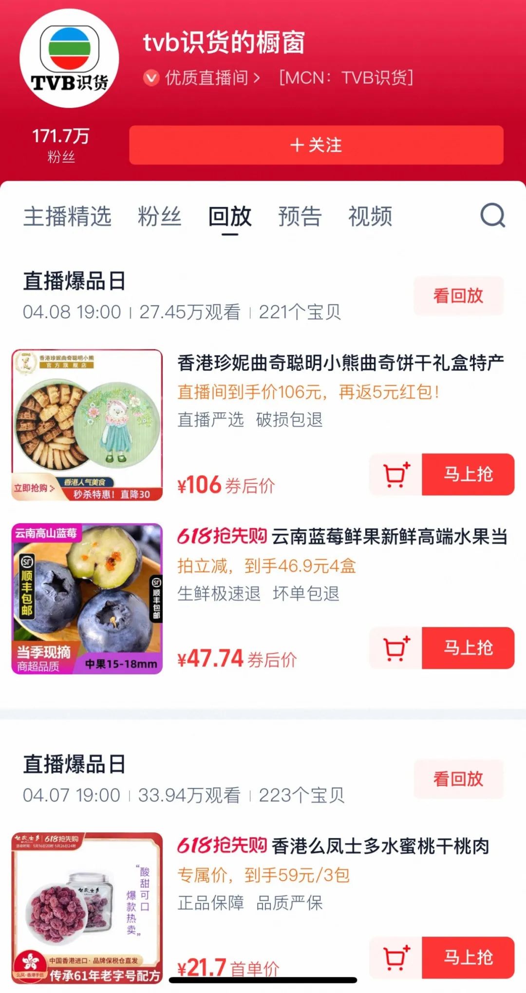 记者查询发现,“TVB识货”直播间仅有少数场次有TVB艺人现身撑场,观看量较2023年首播时大幅下滑,大部分直播观看人次在20万-30万人次水平,部分场次甚至仅有4万-5万人观看。