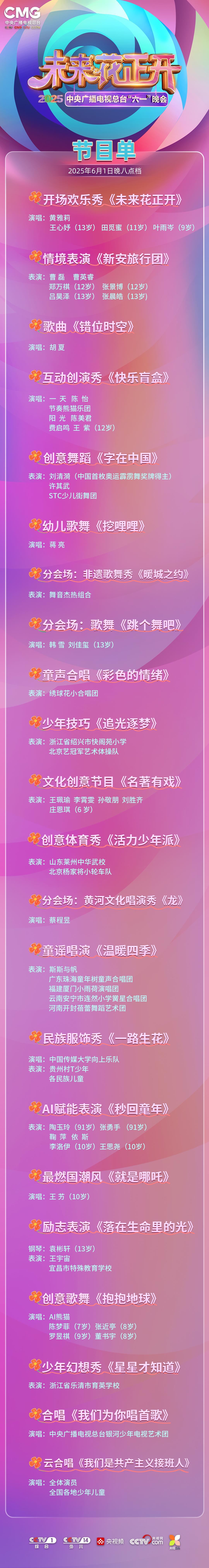 据悉,今年的“六一”晚会将围绕“有志向、有梦想”“爱学习、爱劳动”“懂感恩、懂友善”“敢创新、敢奋斗”四个篇章,通过歌舞表演、动漫串烧、潮酷运动等多样态节目,为孩子们奉上一场视听交融、寓教于乐的节日盛宴。