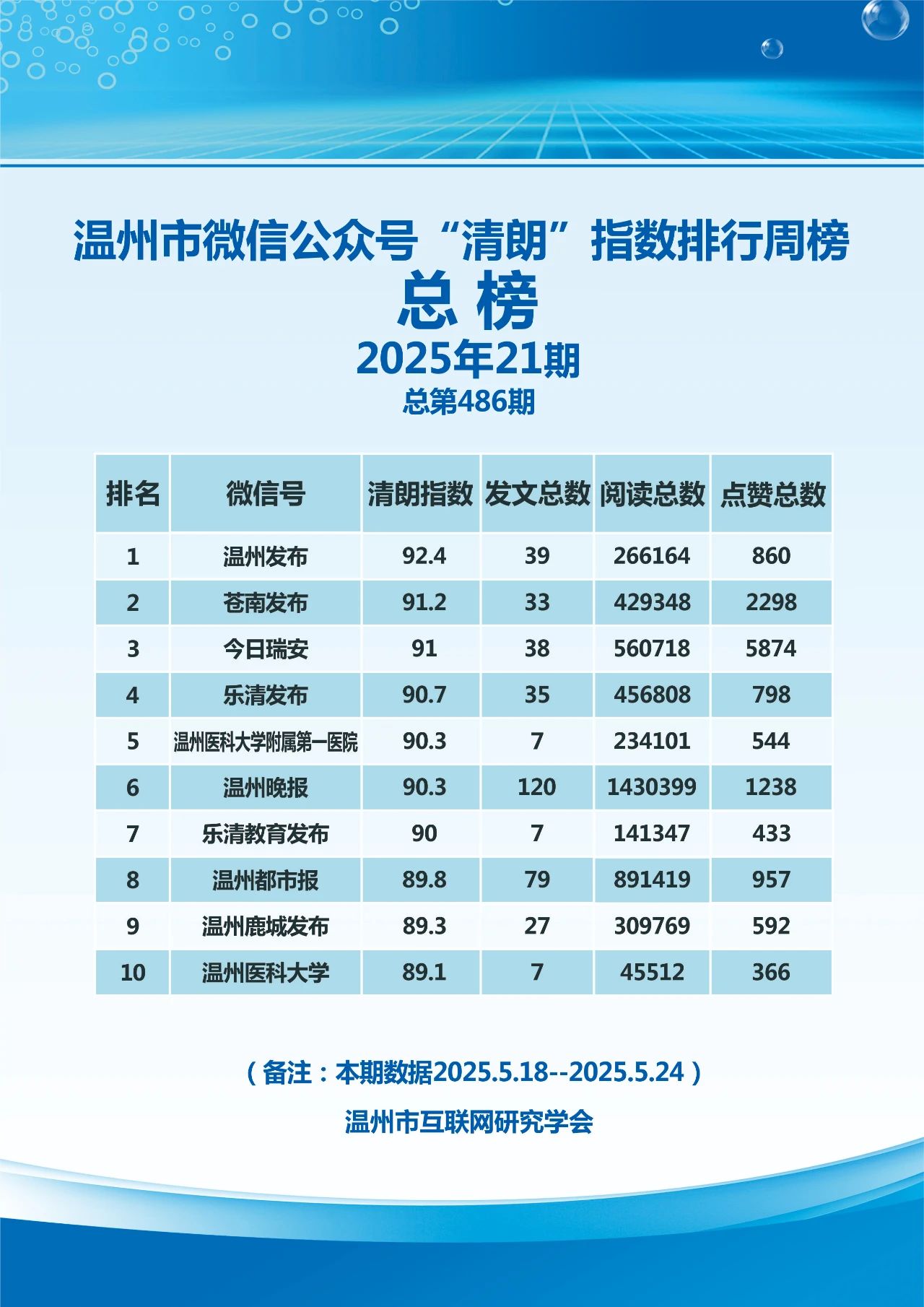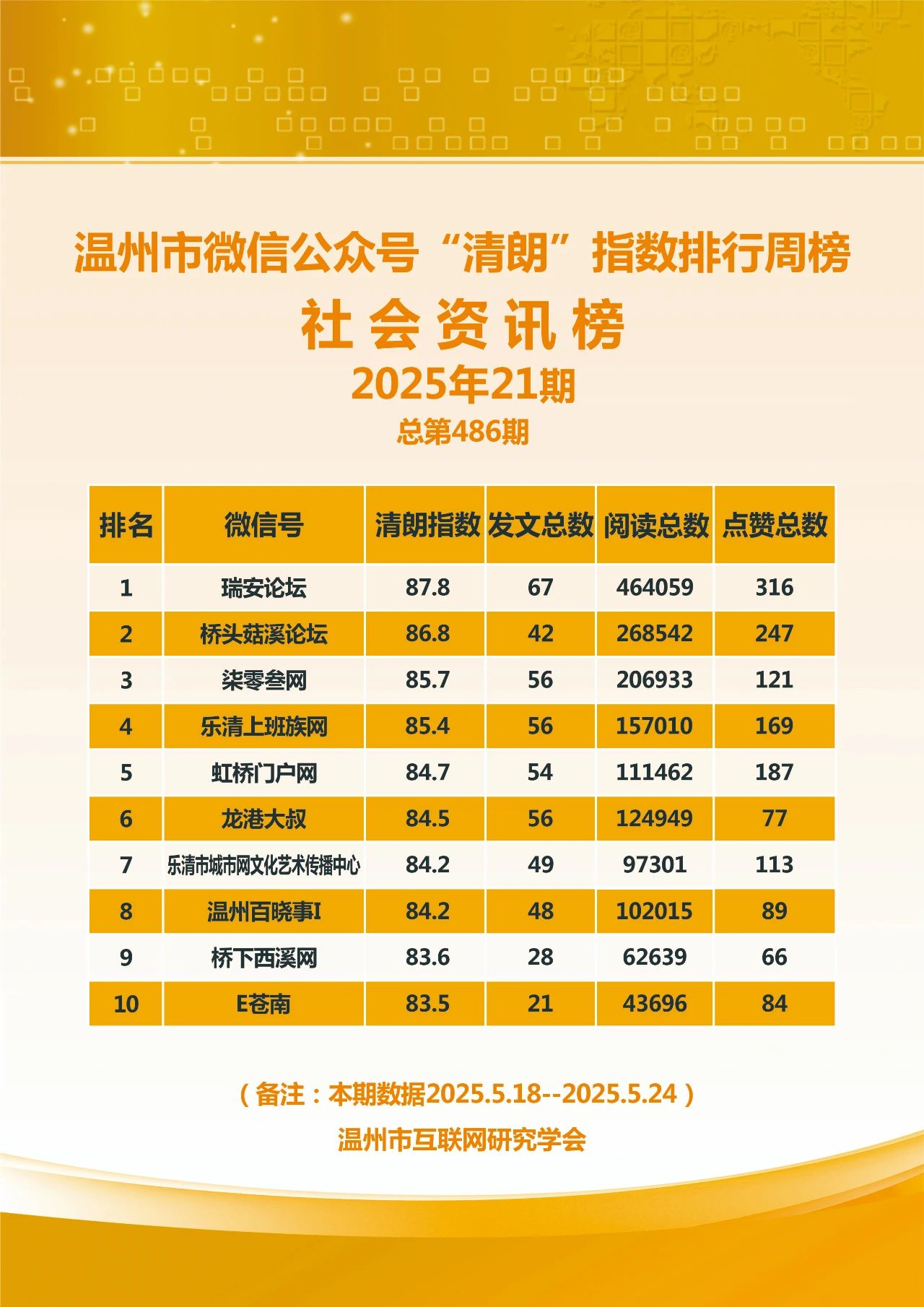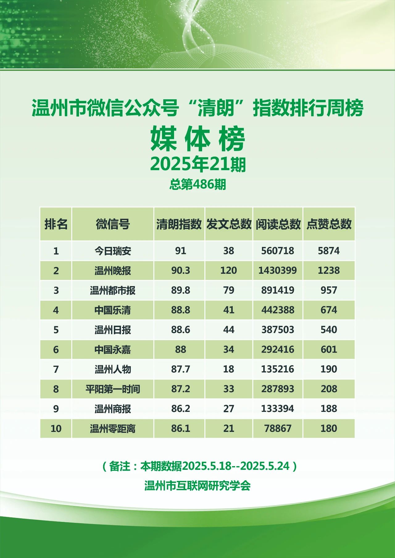 本期,温州市互联网研究学会监测时间范围为2025年5月18日至5月24日,分别对4417个微信号和246个抖音号进行了数据采集,共采集微信文章8546篇,抖音视频1438条。