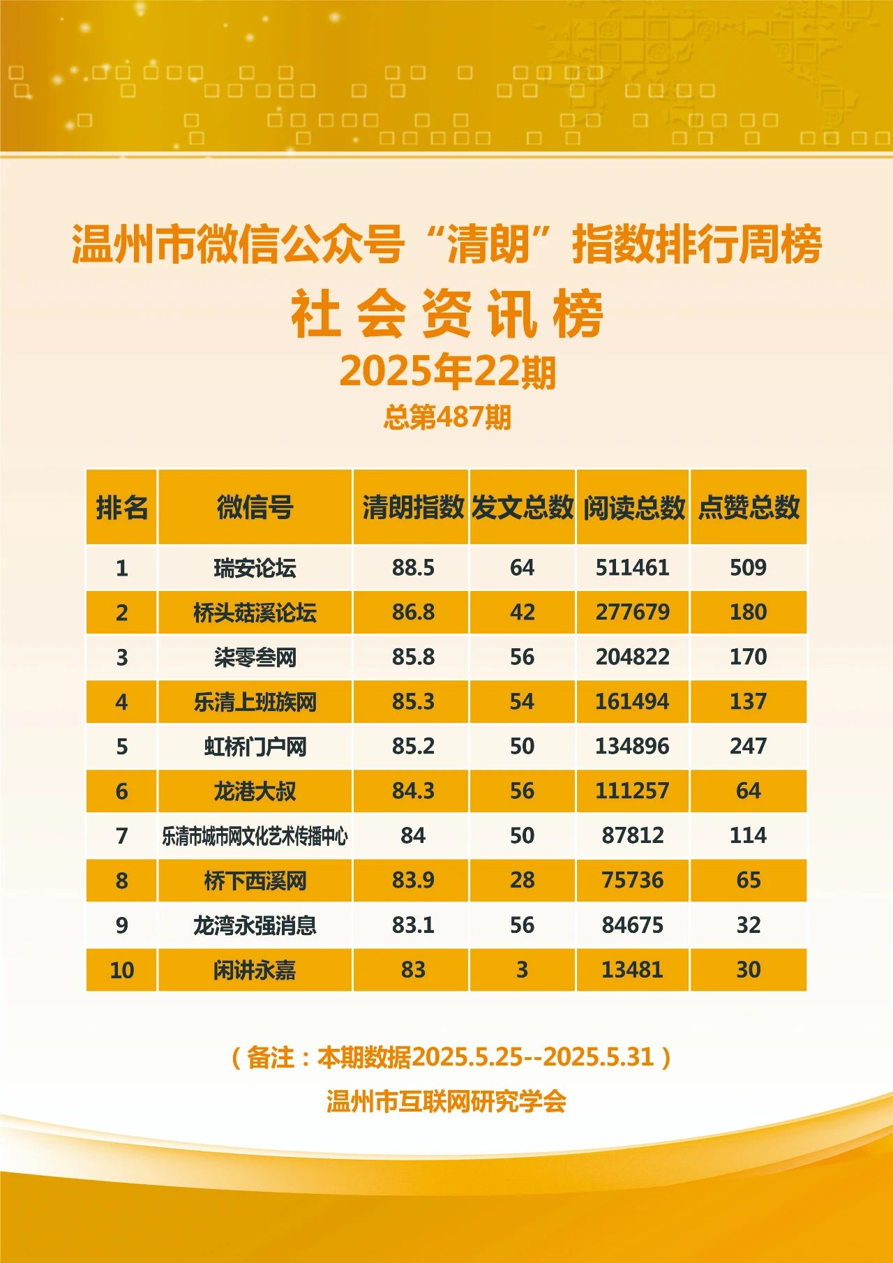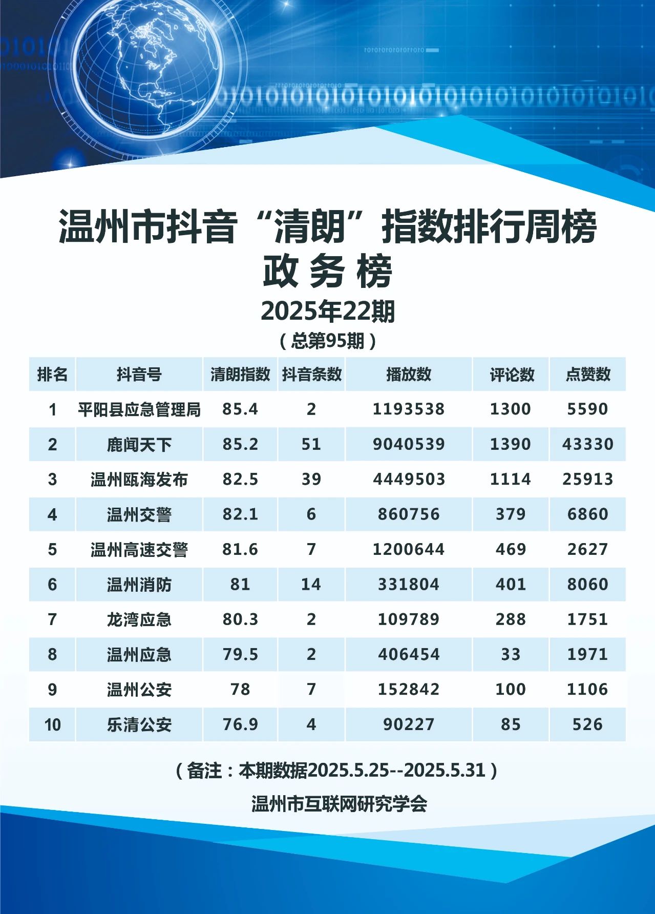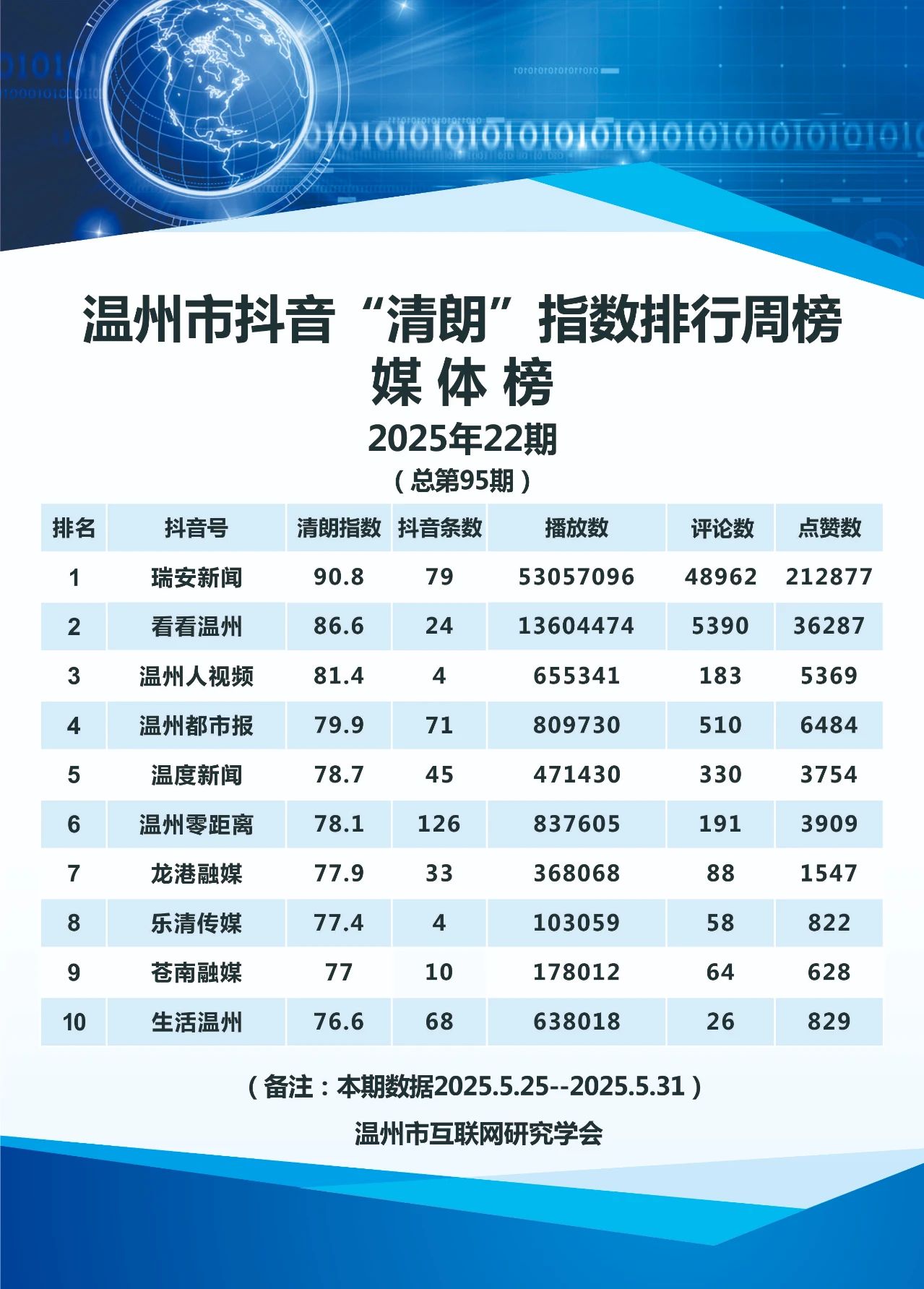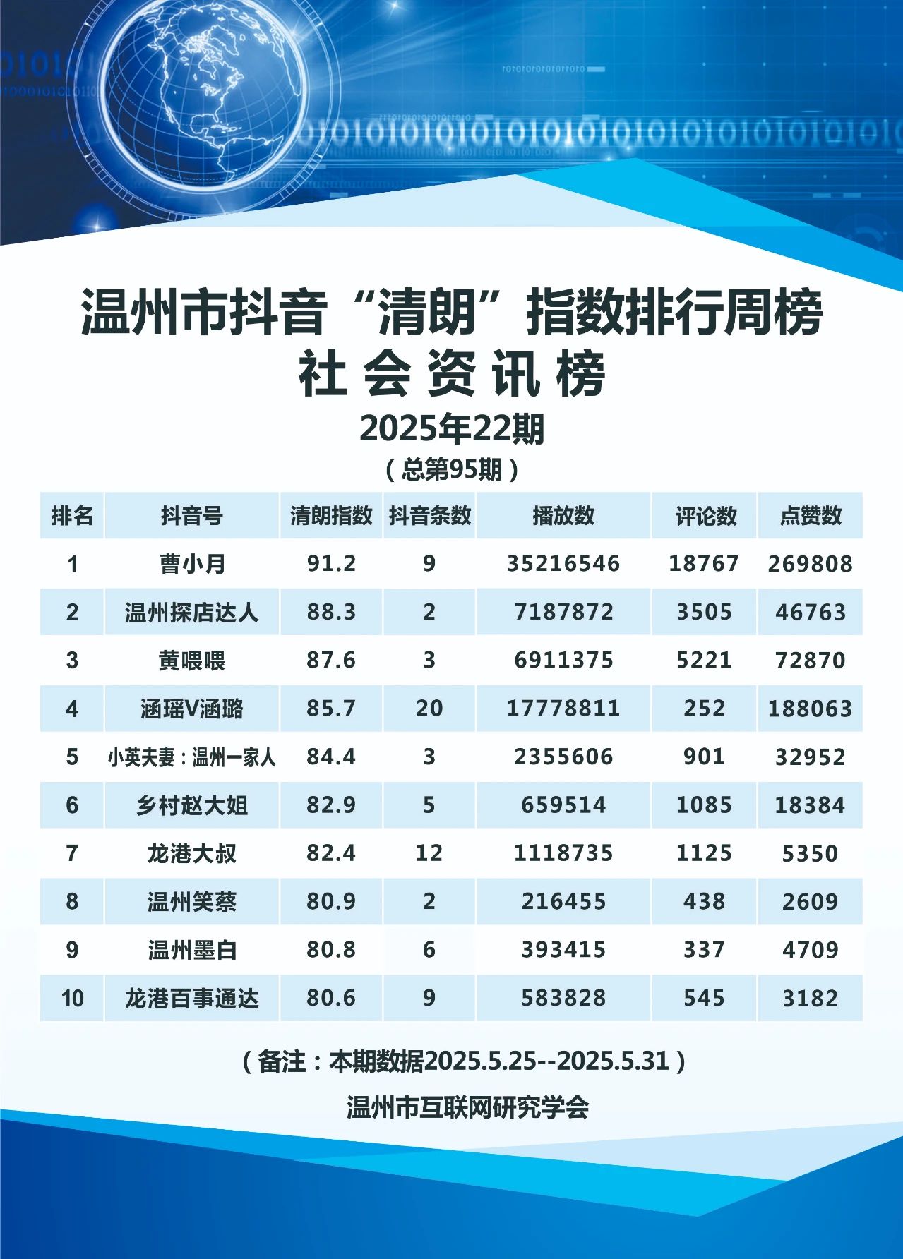 本期,温州市互联网研究学会监测时间范围为2025年5月25日至5月31日,分别对4417个微信号和246个抖音号进行了数据采集,共采集微信文章9237篇,抖音视频1478条。