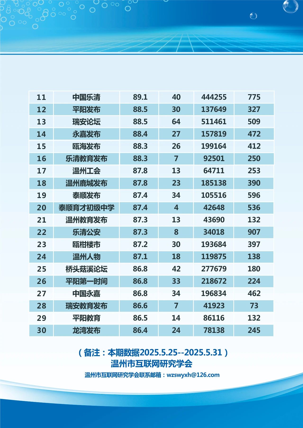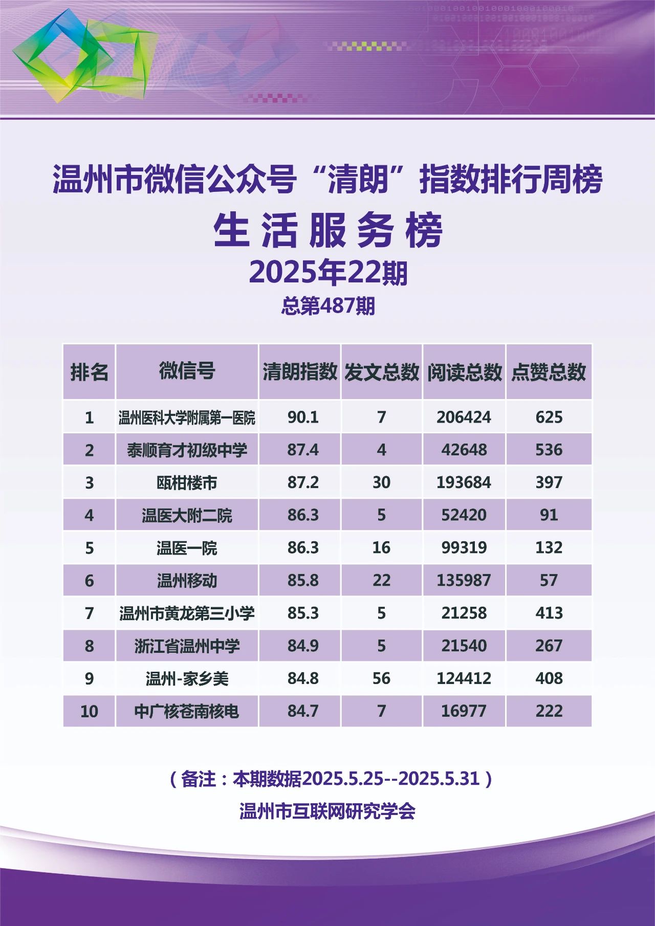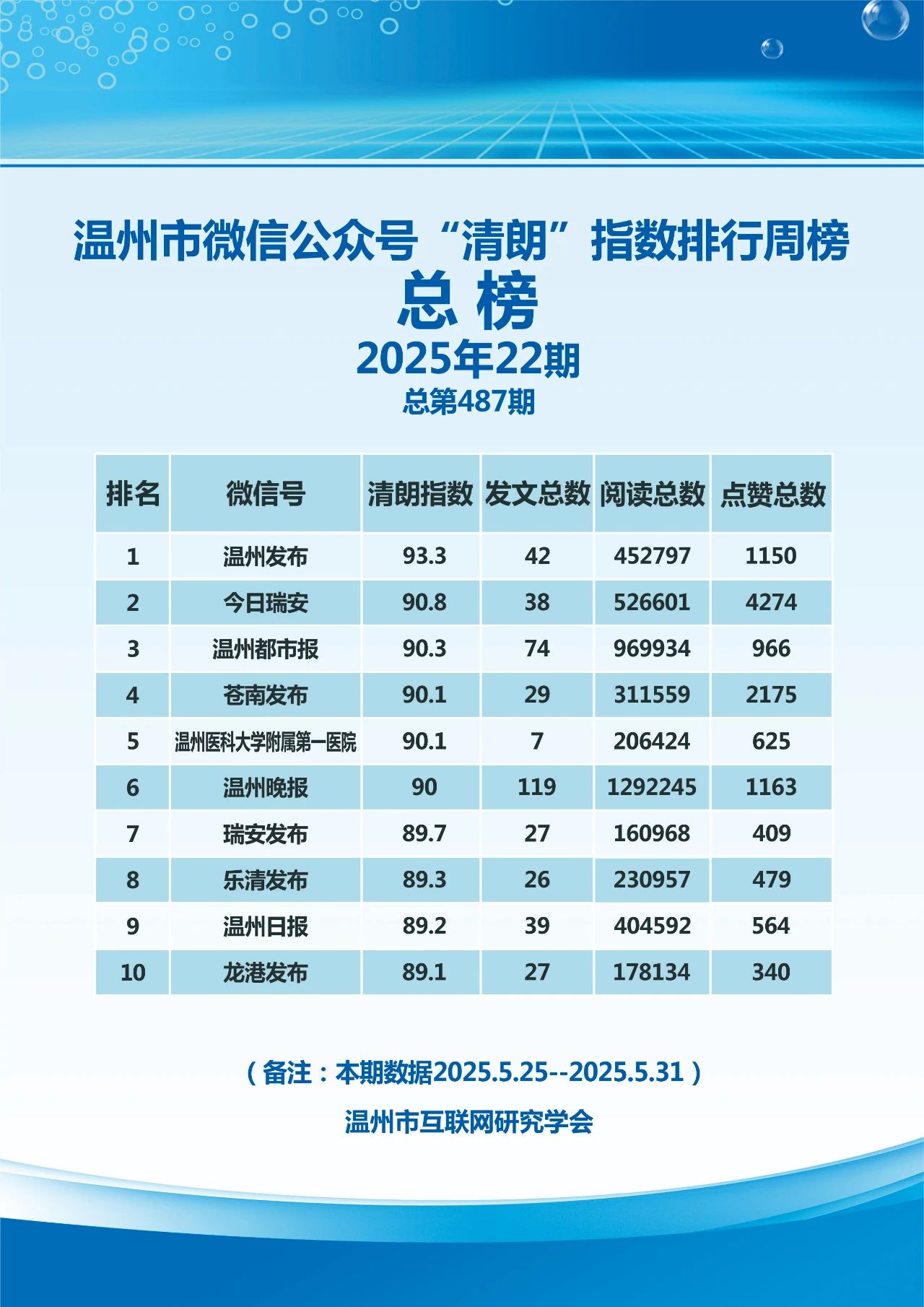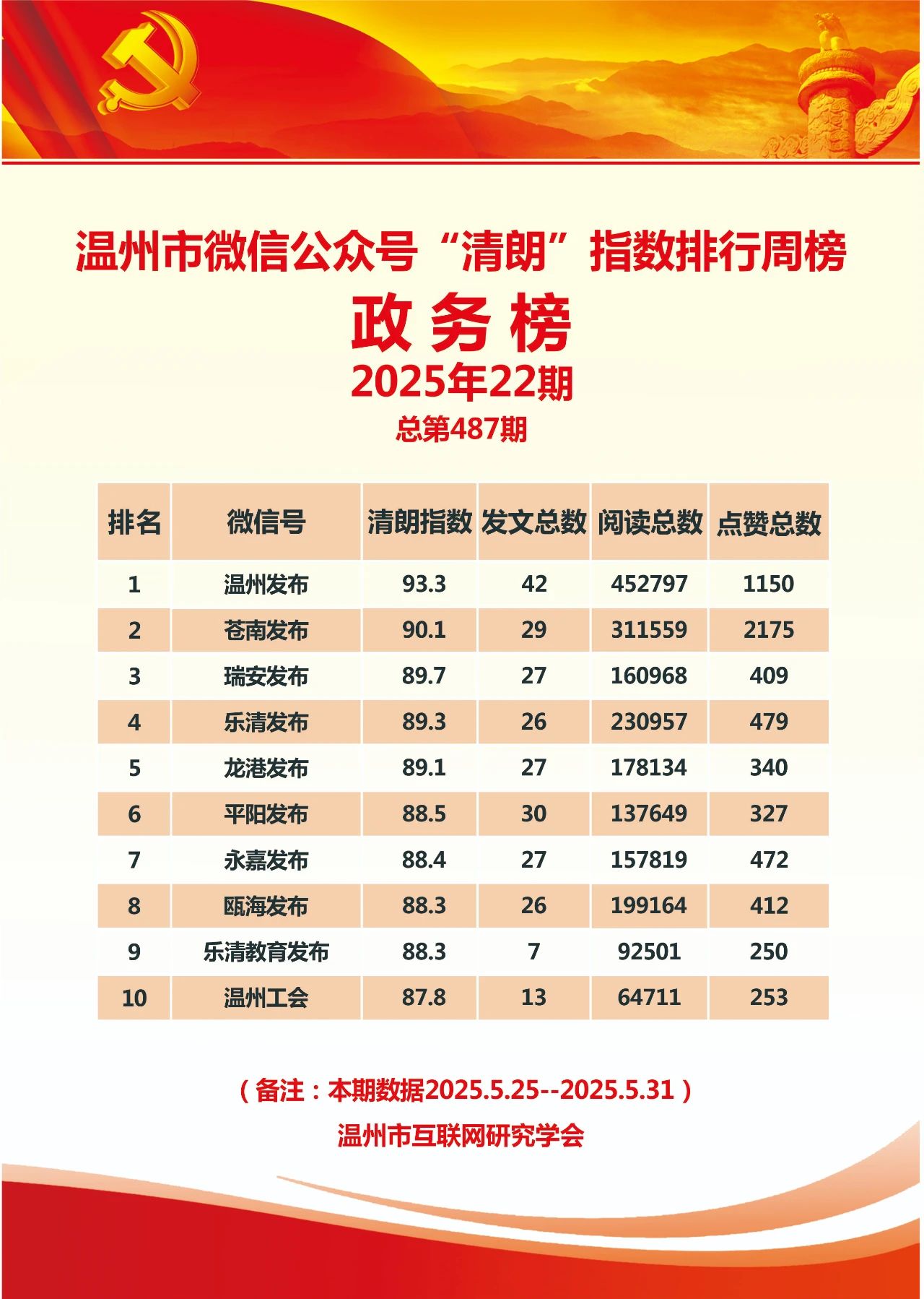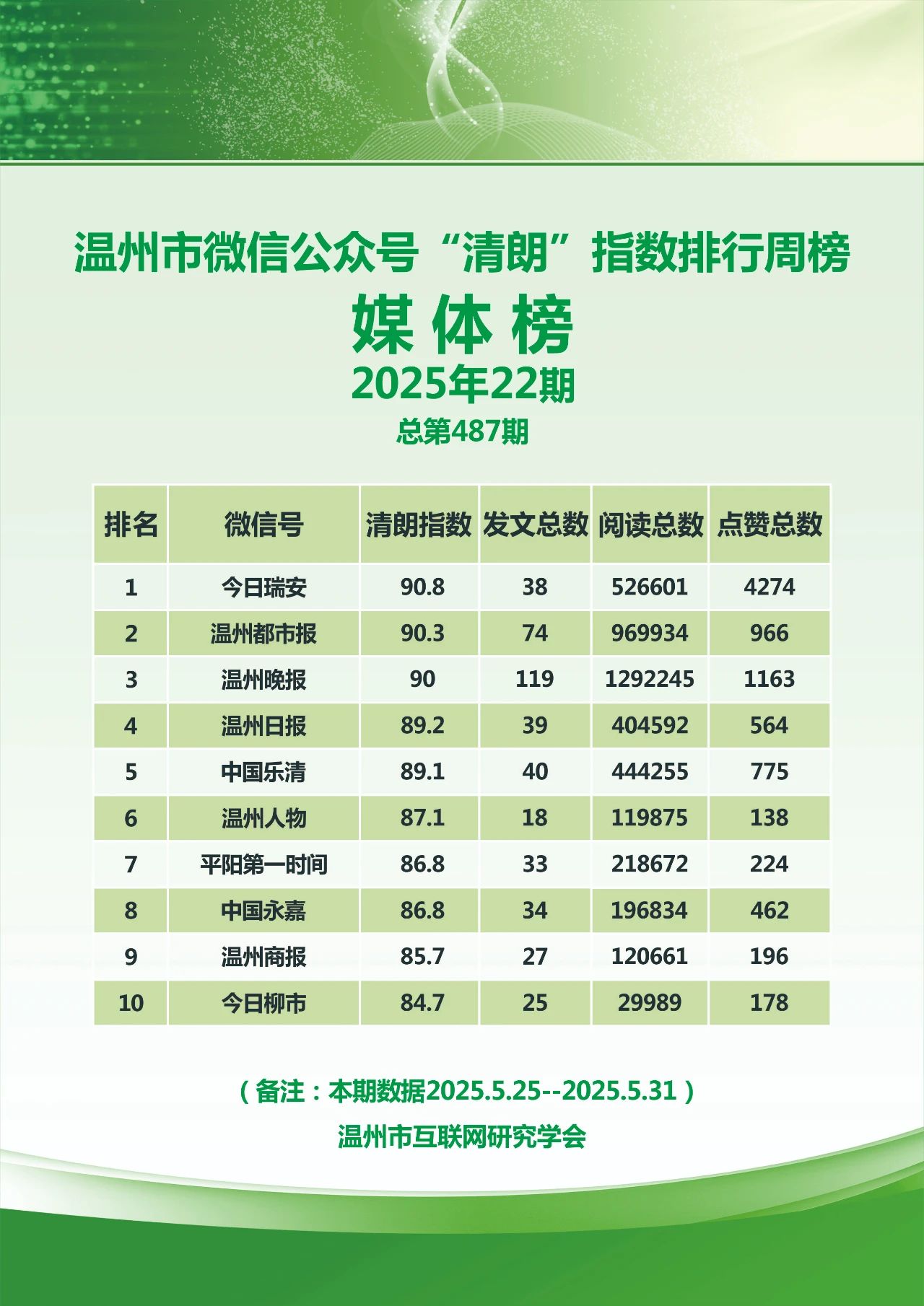 本期,温州市互联网研究学会监测时间范围为2025年5月25日至5月31日,分别对4417个微信号和246个抖音号进行了数据采集,共采集微信文章9237篇,抖音视频1478条。