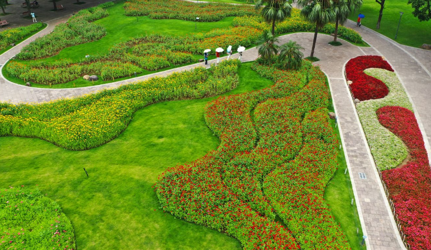 五色花海在阳光下交相辉映,宛如一幅天然油画,微风拂过,花浪起伏,更添灵动之美,吸引众多市民游客前来观赏打卡,尽享夏日浪漫花事。