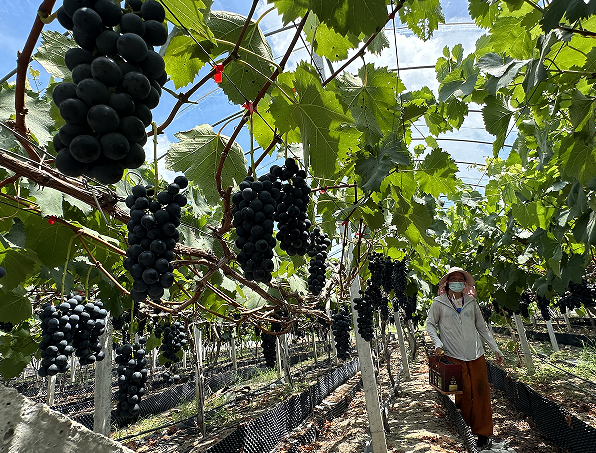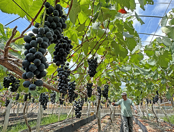6月30日,苍南县璞珹葡萄联合社的华允将来到蒲城葡萄基地,看到自己基地独有的特早熟品种“天工墨玉”一串串葡萄如珍珠点缀在枝头,弥漫着夏日的甜蜜和丰收的喜悦。由于该品种葡萄比其他品种的葡萄提前上市20多天,也在市场获得先机,价格在20元/斤左右。该品种葡萄是浙江昌蒲农业科技有限公司和浙江省农业科学院园艺所联合培育,曾获得全国早熟优质鲜食葡萄评比金奖。这种特早熟葡萄新品种引进与稀植轻简化生产技术相结合的科技助农,为农户大大提升了经济效益。