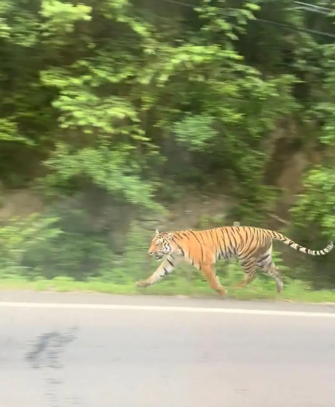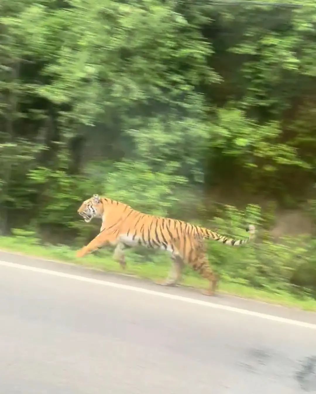 7月3日,一名网友在社交平台分享了其开车路途中偶遇野生东北虎的画面,视频中一只野生东北虎在马路边游荡,看到路边经过的车辆后又迅速窜进树林之中。几秒过后,这只老虎又迅速窜出在马路中间游荡,随后向拍摄者驾车行驶的反方向奔跑离开。