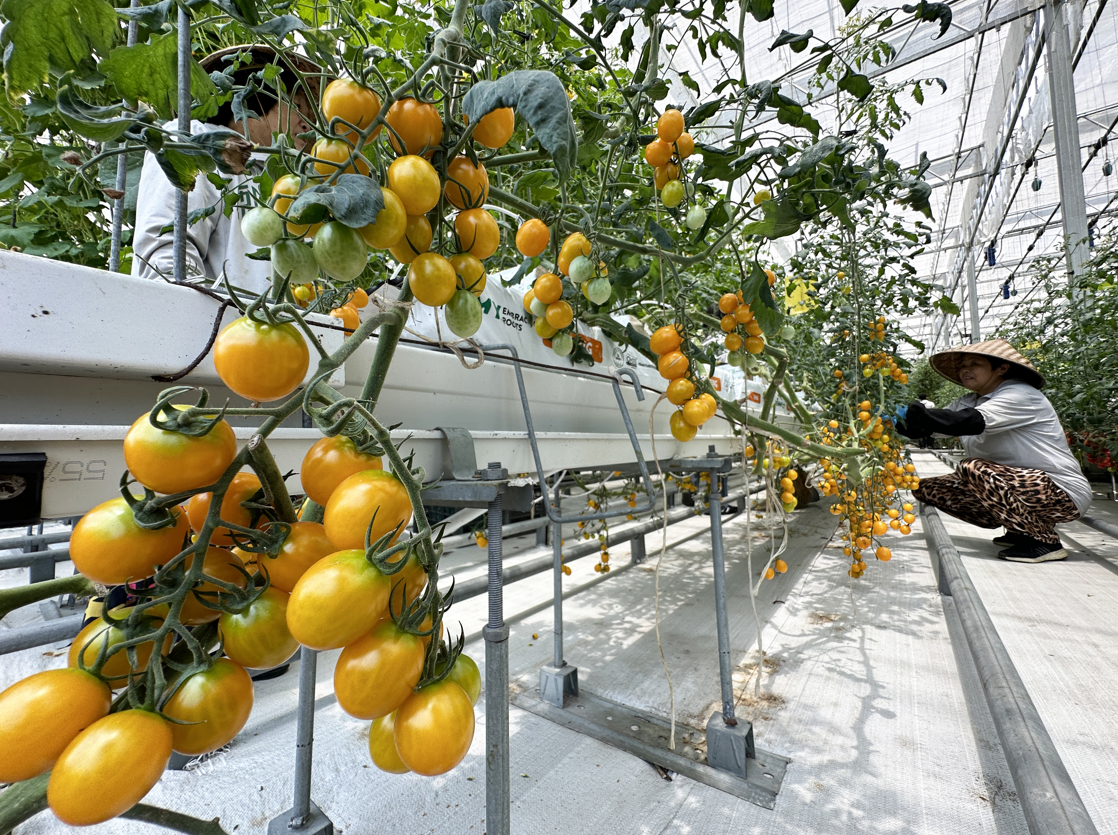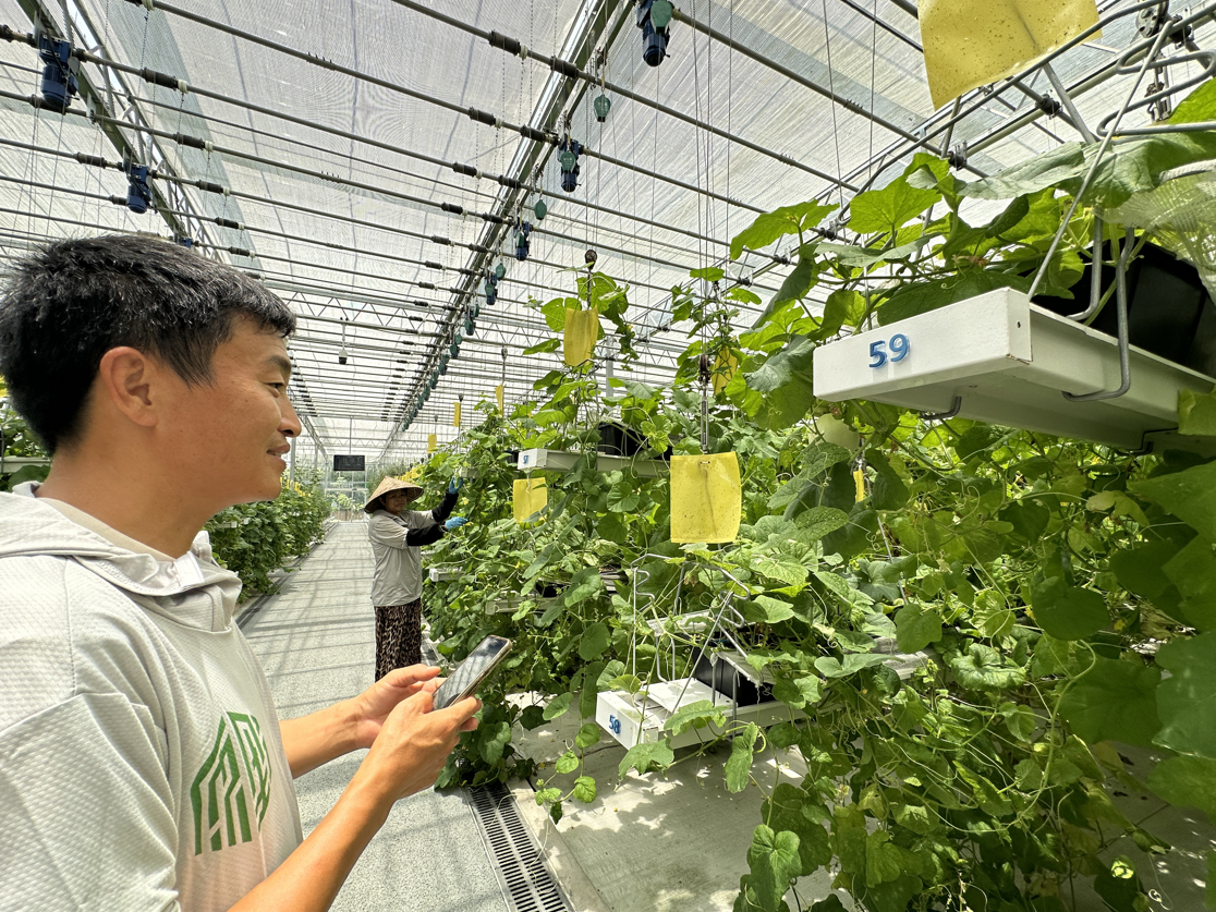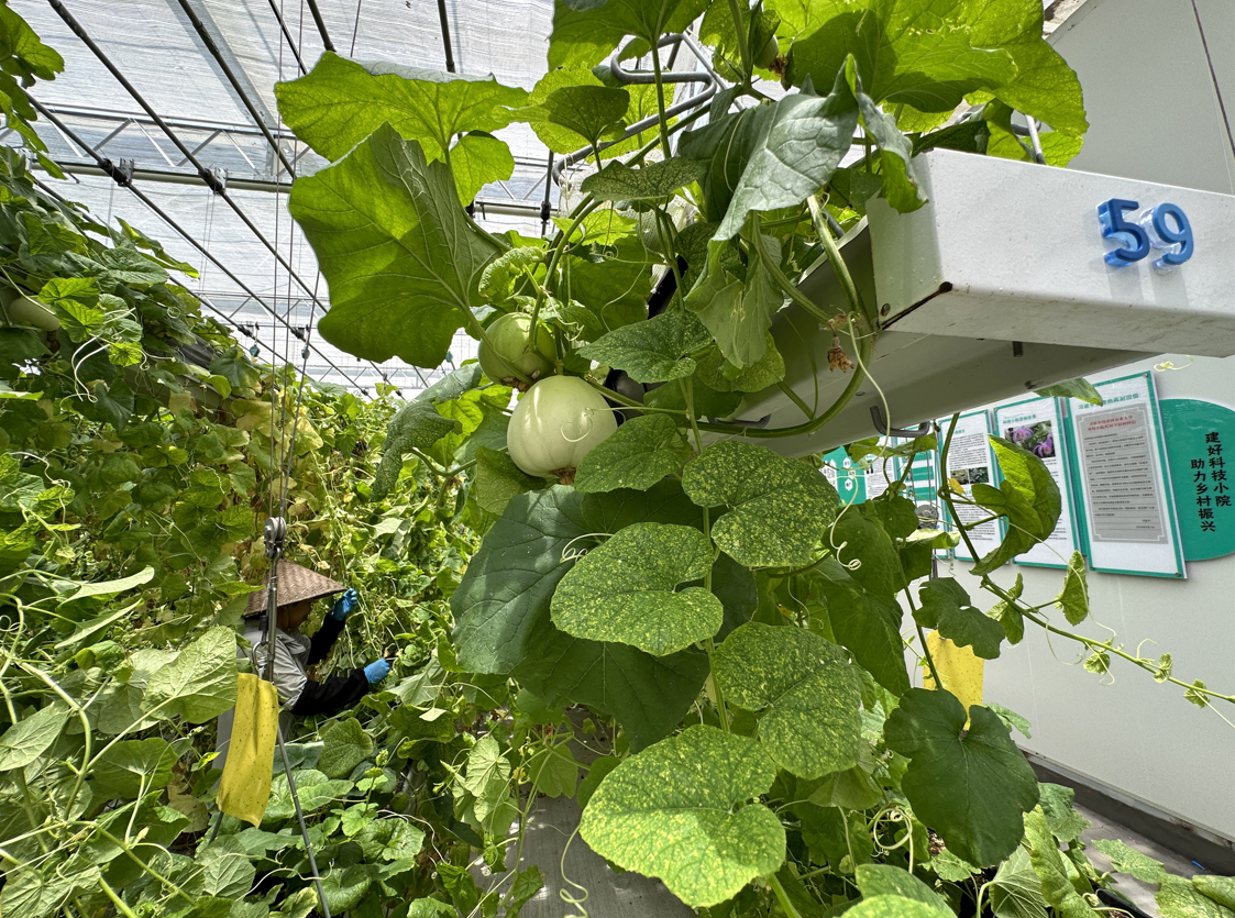 现场技术人员运用手机调控,科学地运用升降栽培系统,提升了栽培空间利用与栽培密度,在动态光环境调控、通风与病害控制、人工作业便捷化及智能化精准管控方面得到提升。如今园内的各种色彩的南瓜、新试种的水果黄瓜、及白瓜、茄子等纷纷结出硕果,收获满满。
