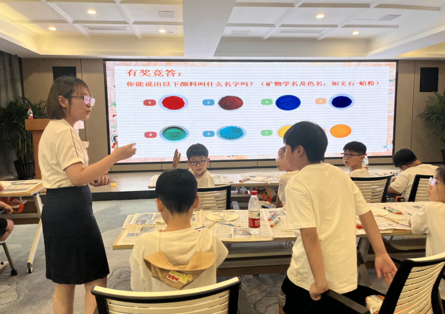 参观完地质科普展厅,经过中午的休整,“小候鸟”们开启了下午学习岩彩知识、矿物扇面绘画的环节。来自温州地质科普馆的吴丹老师,给孩子带来趣味岩彩课堂。吴老师向孩子们讲述了岩彩的历史演变,它的形态、用法、用途。随后,吴老师拿出一盒矿物岩彩,里面是绿松石、雌黄、红石、雄黄等用于作画的矿物,引得“小候鸟”们纷纷上前观看。