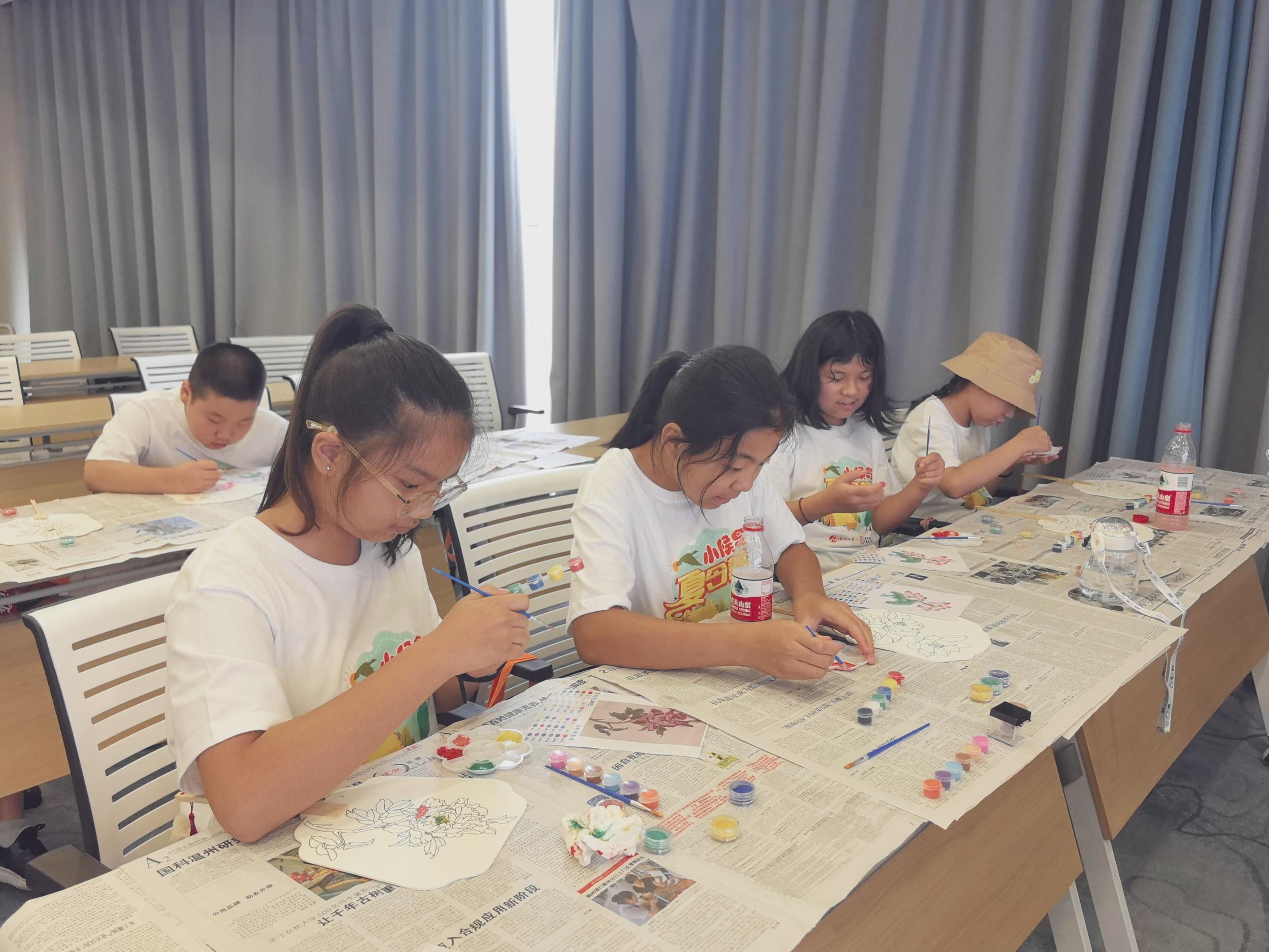 课程结束后,就来到了当天的重头戏——制作岩彩画扇环节。“小候鸟”们化身小画家,将岩彩矿物按自己的想法在扇面上创造出独一无二的作品。来自河南的冯子琳率先完成了创作。她选用石榴石、柠檬石、泥岩等岩彩绘做荷花,再以两种蓝色作为背景过渡,色彩和谐,颇具美感。“这个活动真有意思,我还是第一次用岩彩画画呢。”来自湖北黄冈的马青钰寥寥几笔,一朵迎春花就跃然纸上。