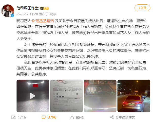 视频显示,范丞丞遭私生车辆从机场一路尾随至停车场,工作室工作人员多次下车劝阻,私生短暂离开后竟突然倒车加速冲撞工作人员。私生饭,网络用语中指侵犯明星的私生活及工作的粉丝。私生饭以侵犯明星隐私,通过偷窥,跟踪,偷拍等极端形式,了解明星私人生活的一举一动。这种行为既给明星本人带来重大困扰,同时也可能扰乱公共秩序,对公共安全构成潜在威胁,并进一步损害明星的声誉。