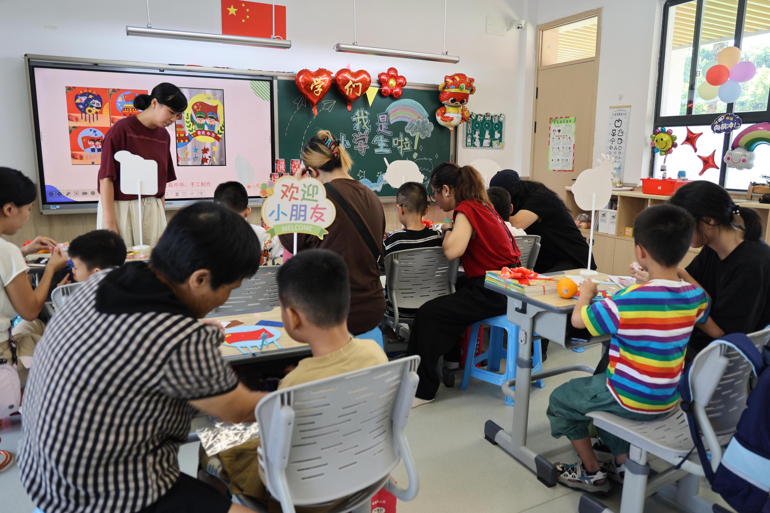 刚进班级,今年8岁的章同学立马上台表演,他表示自己的梦想是当一名篮球运动员,平时最喜欢的是打篮球。“我们发现学生们都卧虎藏龙,厉害到超乎我们的想象。”周欧欧介绍,班上有学生的识字量达1000字,有学生能进行100以内的加减法,也有学生能够背诵古诗词。为此,她设计了开学第一课,兼顾了家长会和亲子活动两个环节,结合家访中了解到学生动手能力较强、部分学生还有绘画特长的情况,选择以手工活动为载体,开展亲子活动——制作爱国手工扇子,向他们传递爱国情怀。下午他们就开始了正式的课程,第一节为科学。