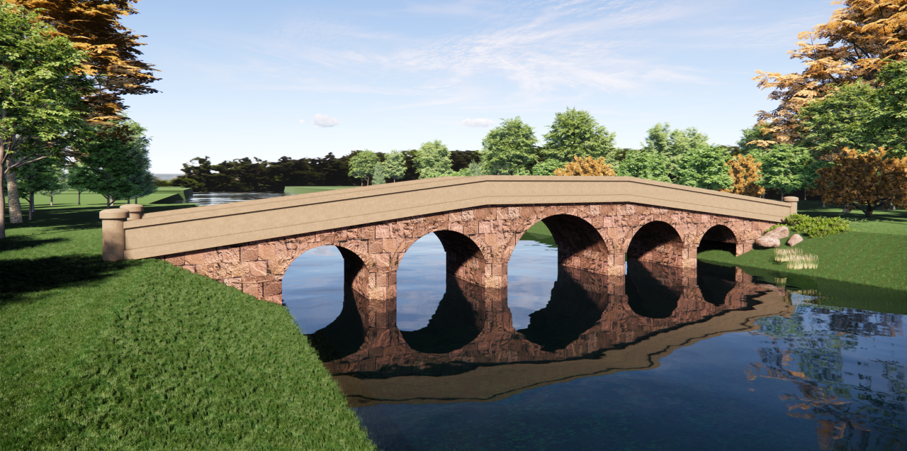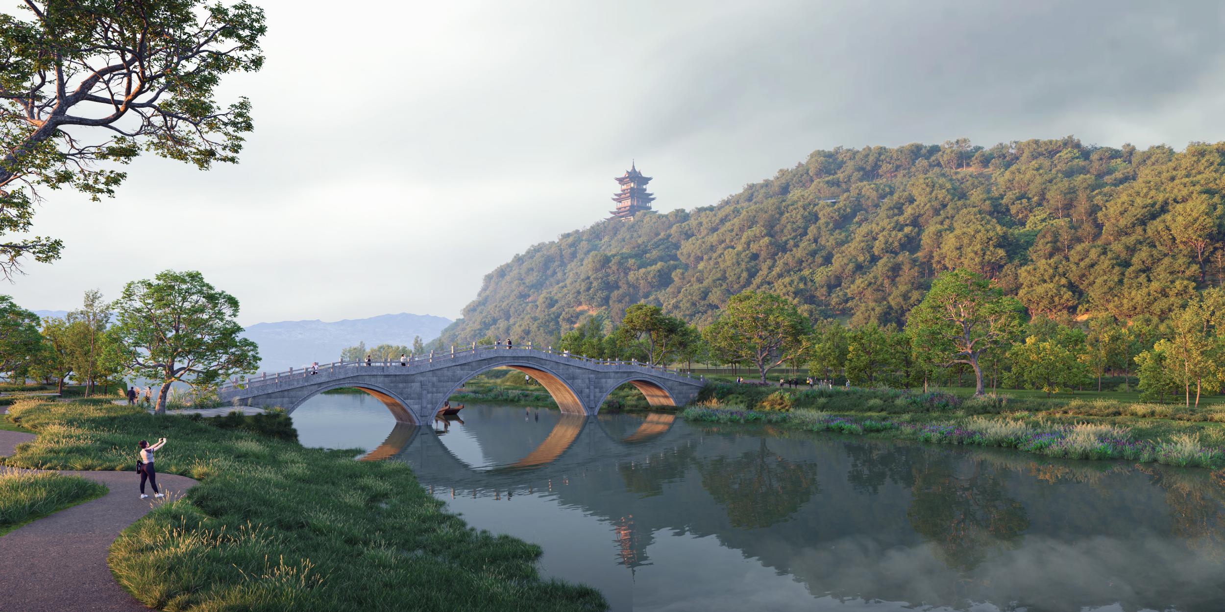 巧思:这座多孔石拱桥,与水相伴倒映在水中时,桥身与碧波交融,光影随水波轻晃,恰好呼应“澄鲜”所描绘的“天空与流水共显清新明净”的意境。