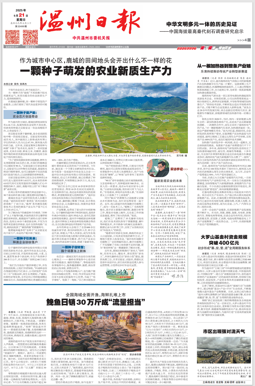 当城市的天际线与稻田的绿浪在城市中心区交汇,鹿城用一颗种子的故事,让我们深刻感受到,新质生产力不是遥不可及的概念,而是扎根泥土、破土而出的生动实践。