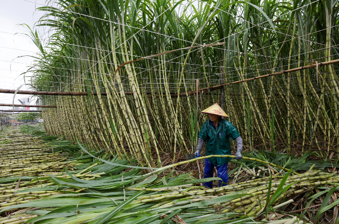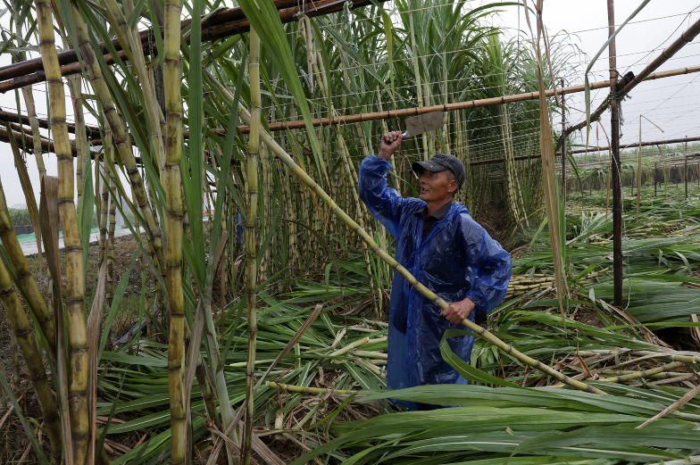 陶山当地的甘蔗种植大户狄优霞称,今年晴多雨少,天气适宜,甘蔗长势很好,长得很高。他种植的300多亩甘蔗迎来丰收,亩产可达8至9吨。当天在收割的甘蔗中间段糖度已经达到13了,下面根部14至15。