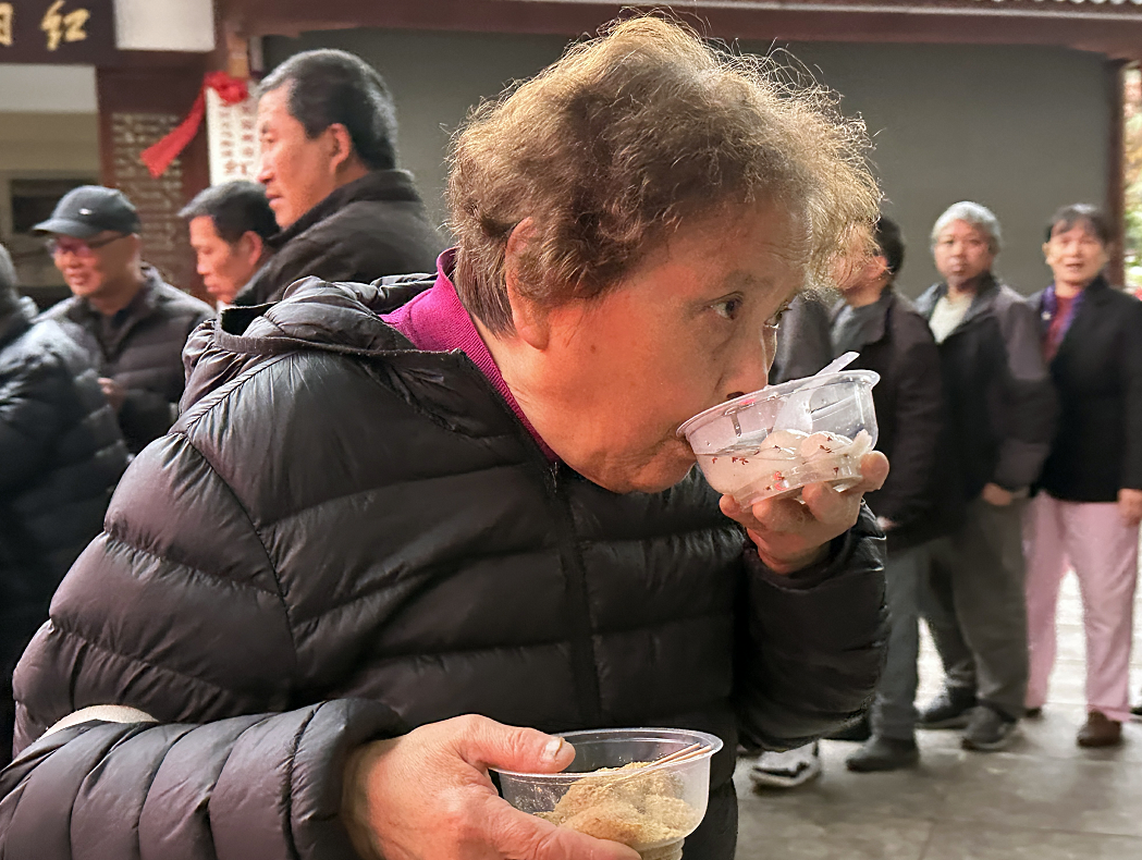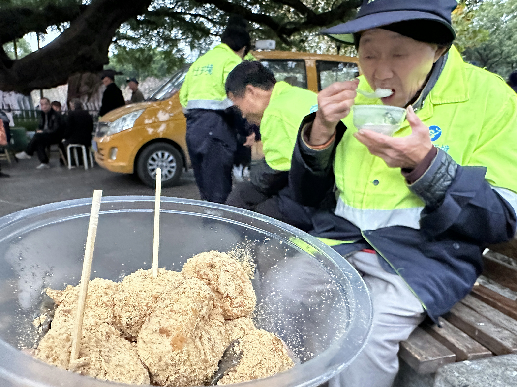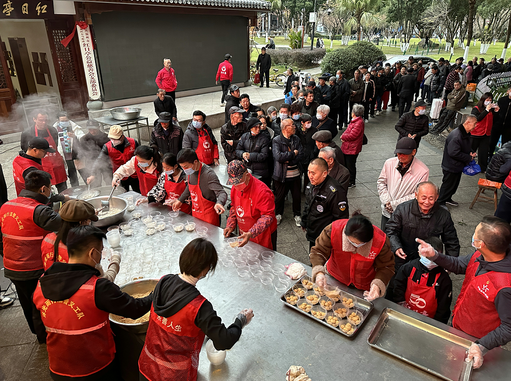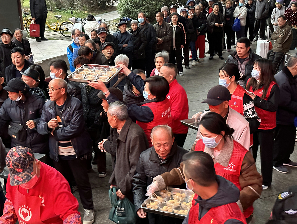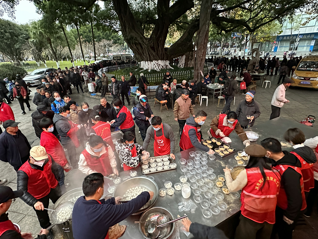温州体彩中心、温州银行和红日亭公益慈善会的20多名义工准备了600斤汤圆,为近千人次的市民,特别是环卫工人、年长老人们奉上热腾腾的麻心汤圆和擂沙汤圆。市民们吃上热汤圆,暖在心里,满是幸福感。