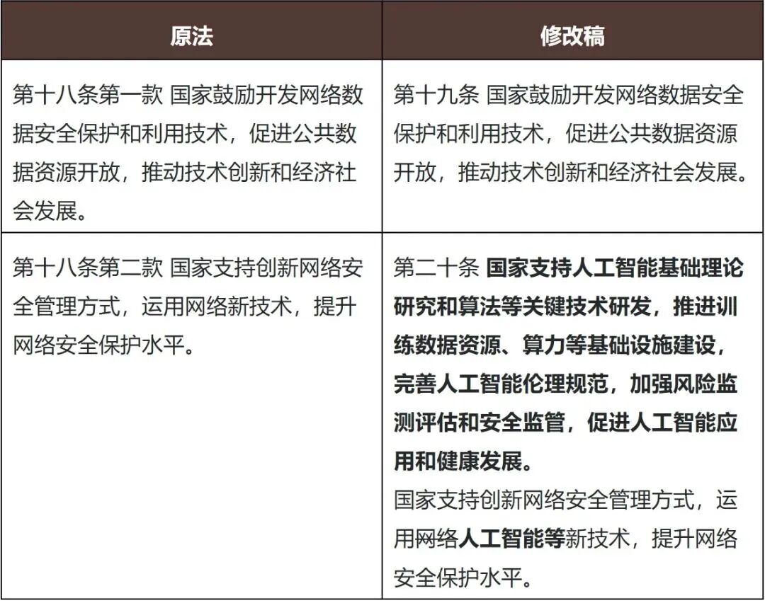 《修改稿》对总则条款进行了增补,将总体国家安全观的内容写入,作为网络安全法治的基本指导,同时首次增加了人工智能条款,从法律层面框定了人工智能发展的基础规范。