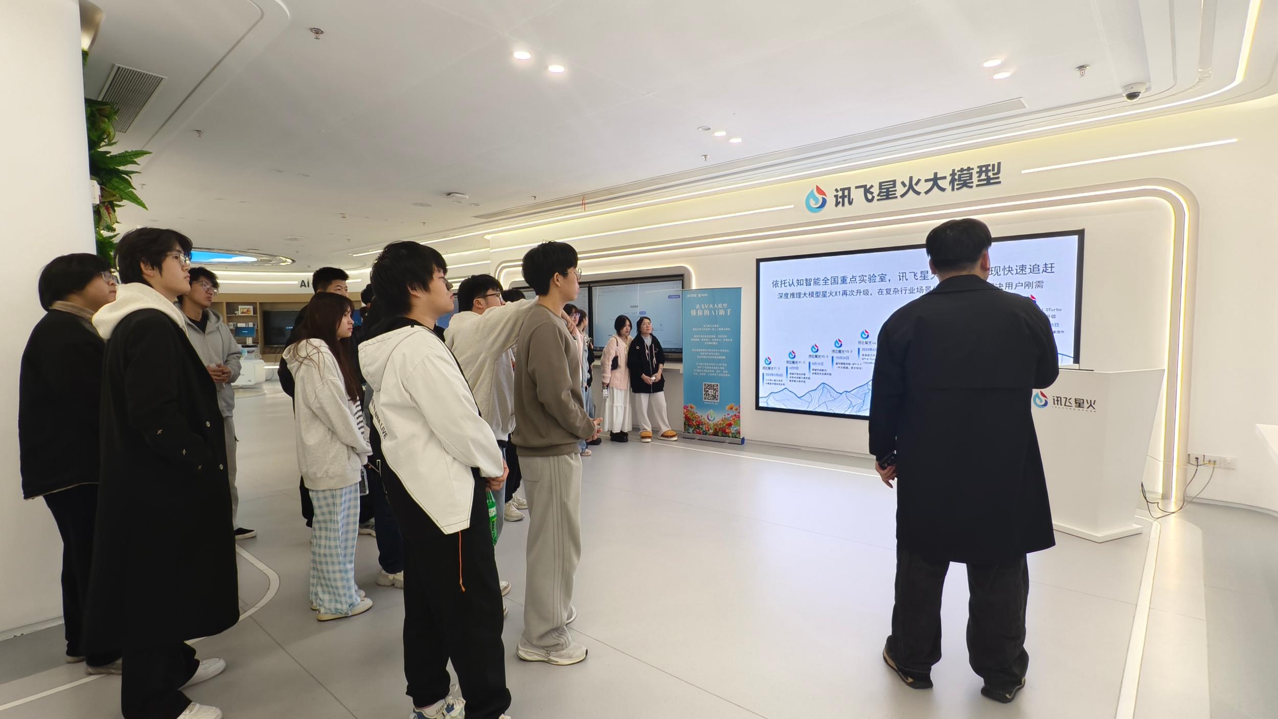 理论学习后,学生们先后走进云软件谷展厅与科大讯飞展厅开展实景体验。在云软件谷展厅,华为等企业的技术成果与智慧医疗、智慧城市等实际应用场景相结合,让学生直观了解技术落地形式;科大讯飞展厅内,学生通过虚拟人人机对话、围棋机器人对弈、奇思妙问课堂等沉浸式项目,感受AI技术在交互、图像识别、机械控制等领域的实际应用,验证了技术原理与实践操作的关联性。