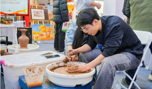 非遗展区突破静态展示,主打沉浸式体验。观众可在土陶制作台前亲手拉坯塑形,在铜器匠人指导下体验錾刻捶打,近距离感受塔吉克族刺绣的精妙针法。麦盖提县干部徐家巍现场演示并邀请游客共创刀郎农民画,“画完即赠”的模式让非遗体验亲切可感。