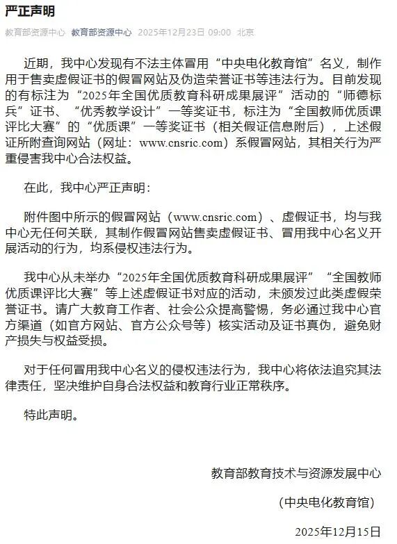 目前发现的有标注为“2025年全国优质教育科研成果展评”活动的“师德标兵”证书、“优秀教学设计”一等奖证书,以及标注为“全国教师优质课评比大赛”的“优质课”一等奖证书,上述假证所附查询网站(网址:www.cnsric.com)系假冒网站,其相关行为严重侵害该中心合法权益。