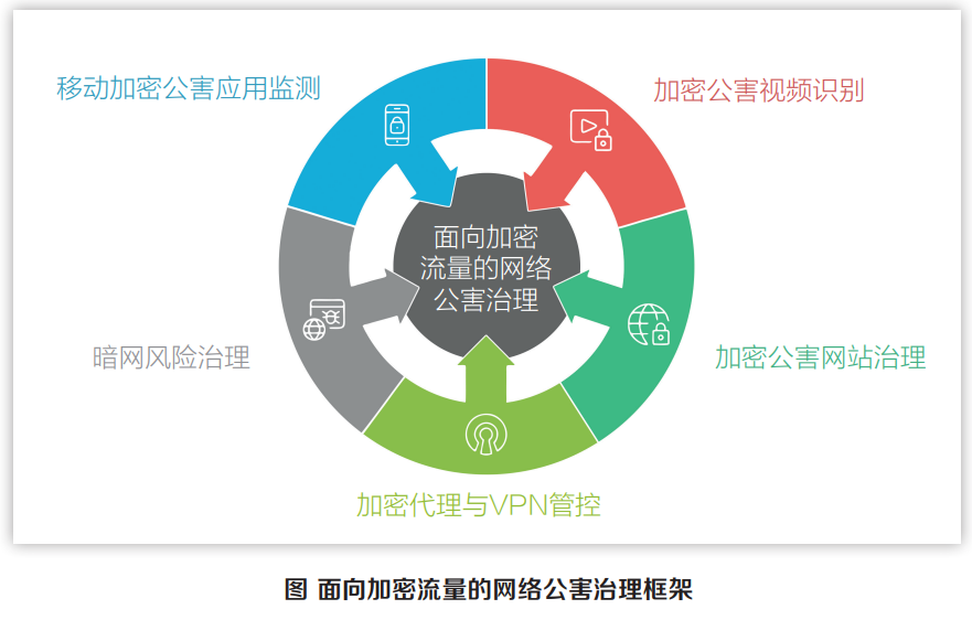 面向加密流量的网络公害治理,需要构建覆盖多场景的立体防控体系,可围绕五大关键领域协同推进(如图所示),分别是加密公害视频识别、加密公害网站治理、加密代理与VPN(虚拟专用网络)管控、暗网风险治理、移动加密公害应用监测。这五大关键领域相互衔接、形成合力,共同筑牢加密流量环境下的网络安全防线。