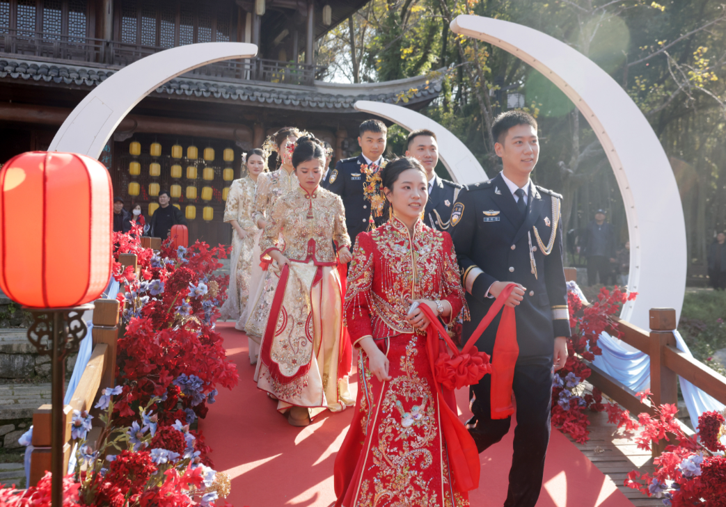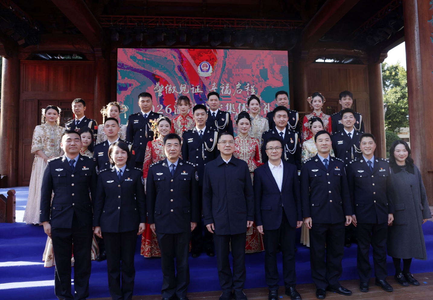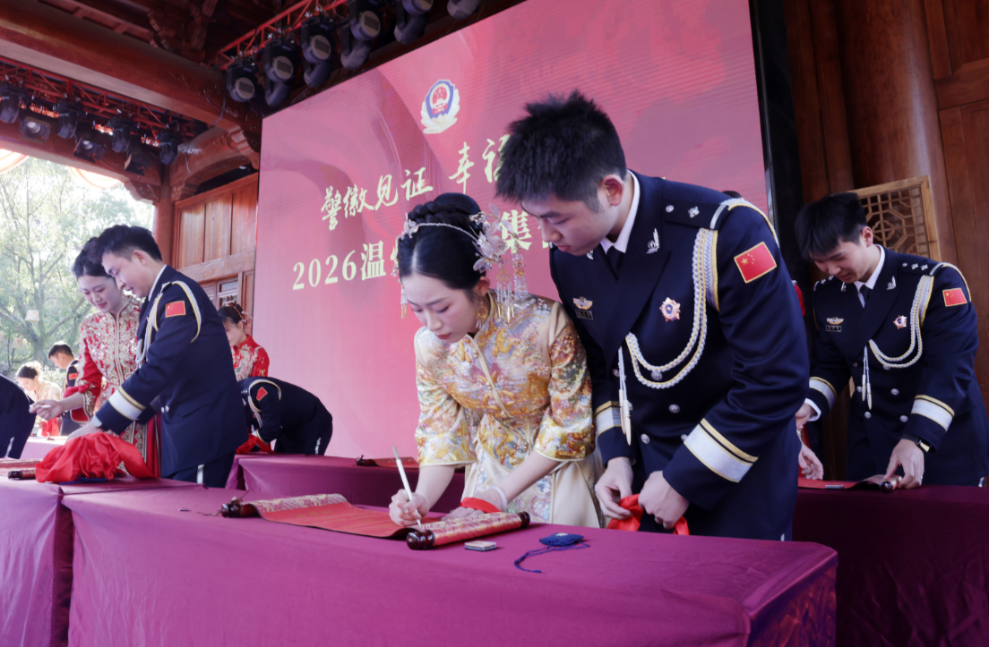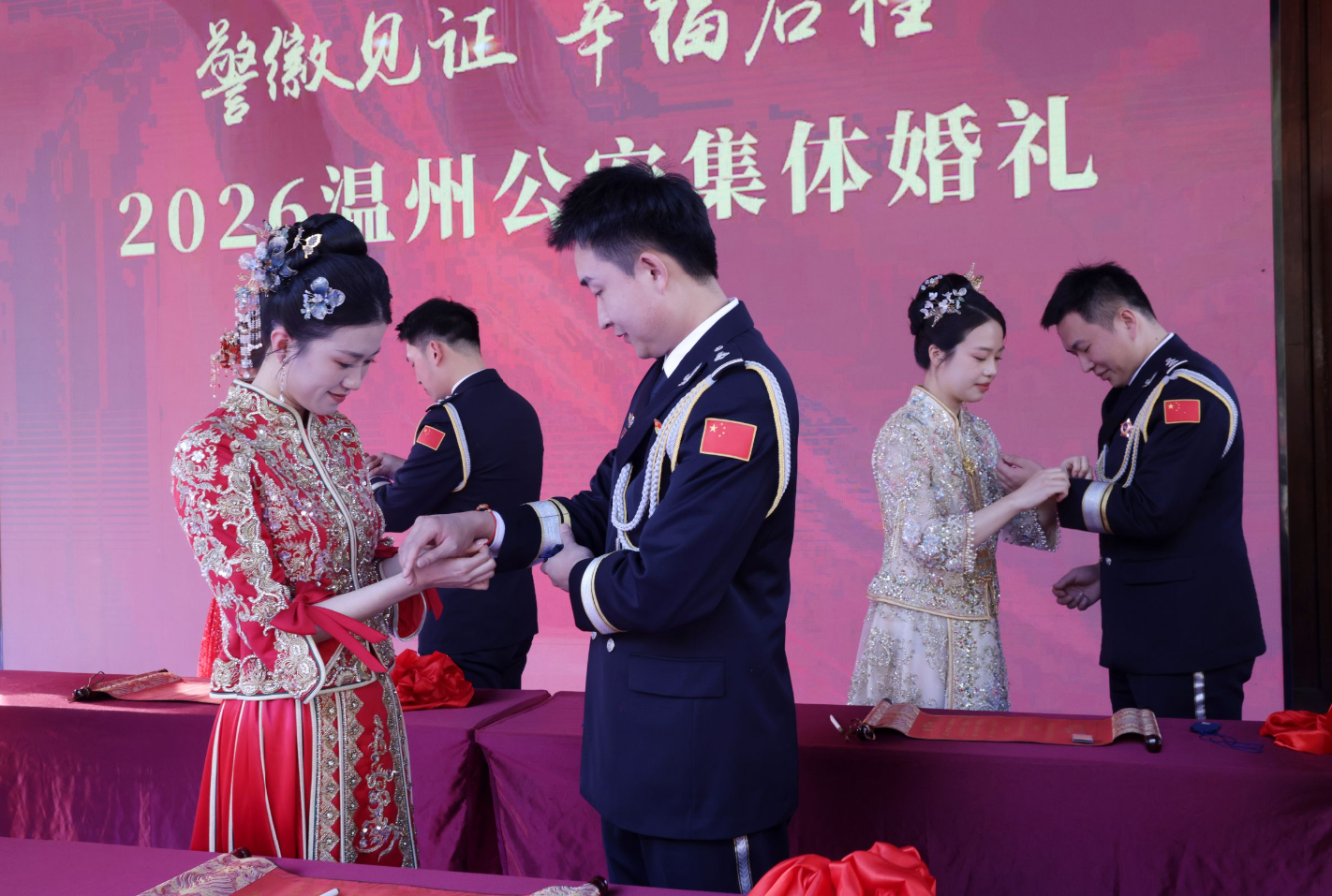 当天,“警徽见证·幸福启程”2026年温州公安集体婚礼在温州市区九山书会举行,九对警营新人并肩而立,他们既有双警家庭,也有警属伴侣。