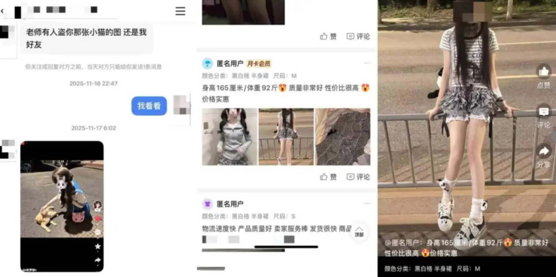 湉湉提供的多张照片显示,她多次与盗图者沟通,但收效甚微。图片被拿去赚钱,这样的行为在网络上被称为“圈米”或“盗图收门槛”。湉湉解释:“被盗图收门槛就是主页他发的照片全是我的照片,个人简介里面会收一个微信门槛,就是你要给他发多少钱,他才会给你把他的朋友圈打开。”还有一些人“顶着”她的长相去网恋诈骗,甚至将照片刷在商家的虚假好评里。尽管她多次私信交涉,对方也仅是暂时将作品设为私密,从未真正删除。