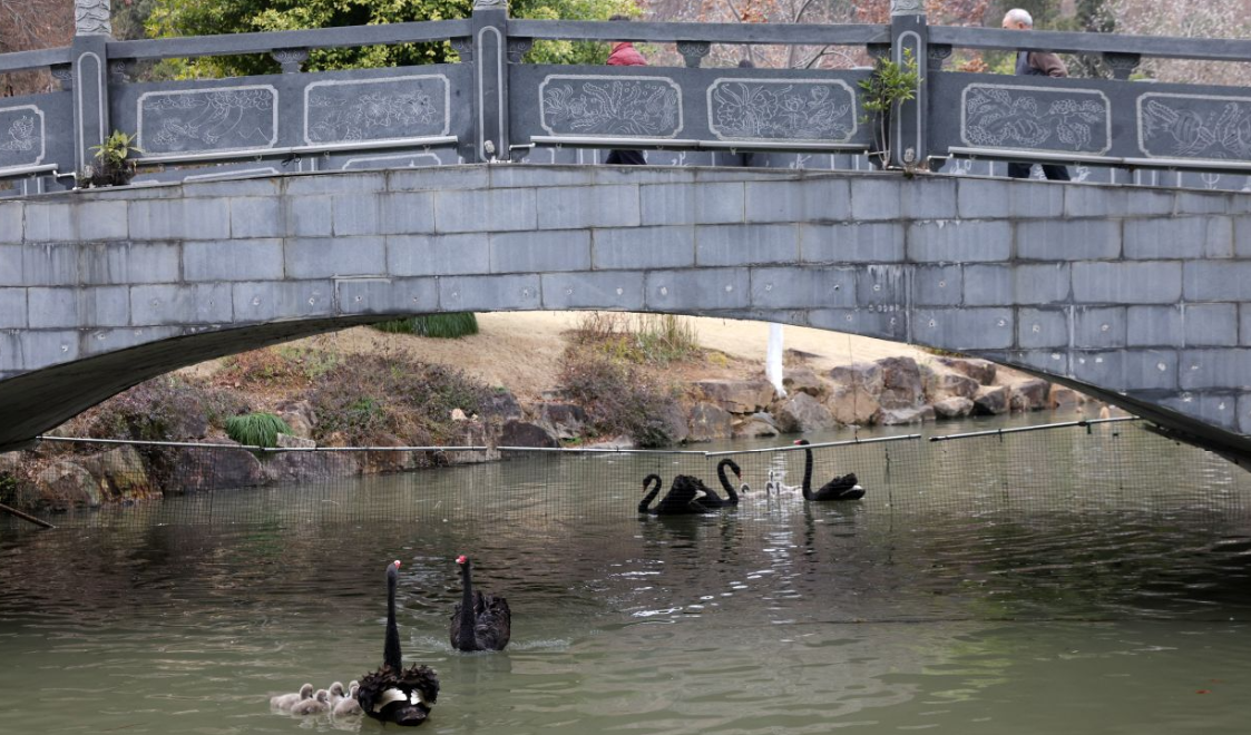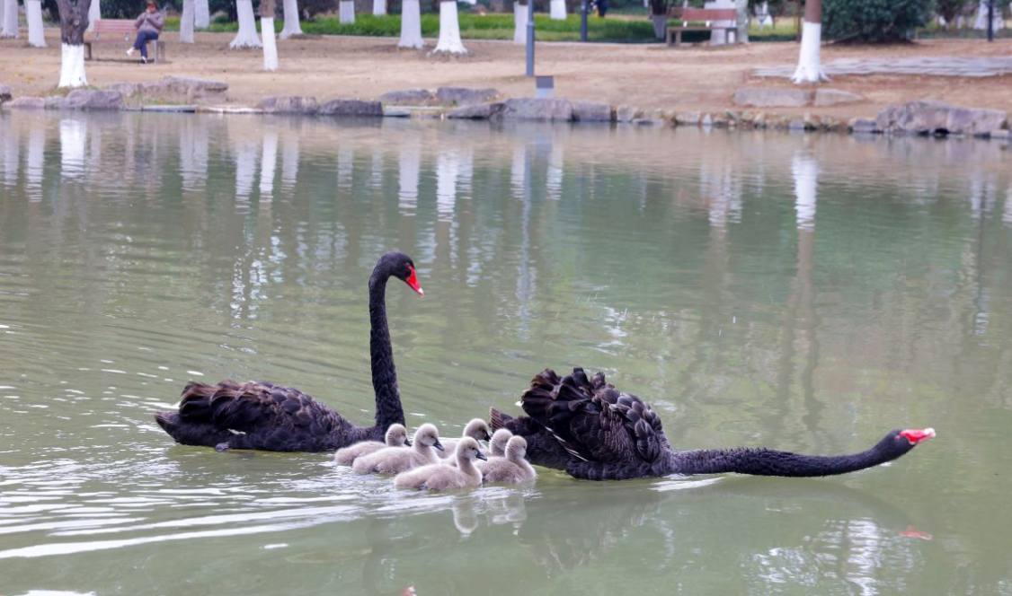 1月29日,温州市区杨府山公园,黑天鹅小萌宝在爸爸妈妈的带领下在湖面上里悠游,吸引了许多市民观看。马年新年伊始,杨府山公园喜讯连连,适逢交配繁殖期的黑天鹅家族猛然添丁。连日来,3户黑天鹅家族总共成功孵出18只毛茸茸的小萌宝,新生的小天鹅们绒羽未丰,紧紧跟随在父母亲身边,在公园奥水湖湖面上蹒跚试水,时而追逐嬉戏,为秀丽的湖面增添了生机与萌趣,温馨动人的情景成为公园一景,也是杨府山公园生态日益优良、环境宜人的生动写照。
