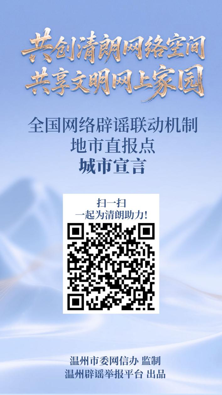 1月26日下午,以“深化辟谣联动 共建清朗网络”为主题的全国网络辟谣联动机制直报点建设现场推进会在浙江温州举办。会上,全国网络辟谣联动机制直报点共同发出《“共创清朗网络空间·共享文明网上家园”城市宣言》,号召社会各界坚守理性,做真实信息的守护者;主动作为,做谣言治理的行动者;凝聚合力,做清朗空间的共建者;弘扬新风,做网络文明的践行者,合力开拓更加健康、向上、美好的网络时代新未来。