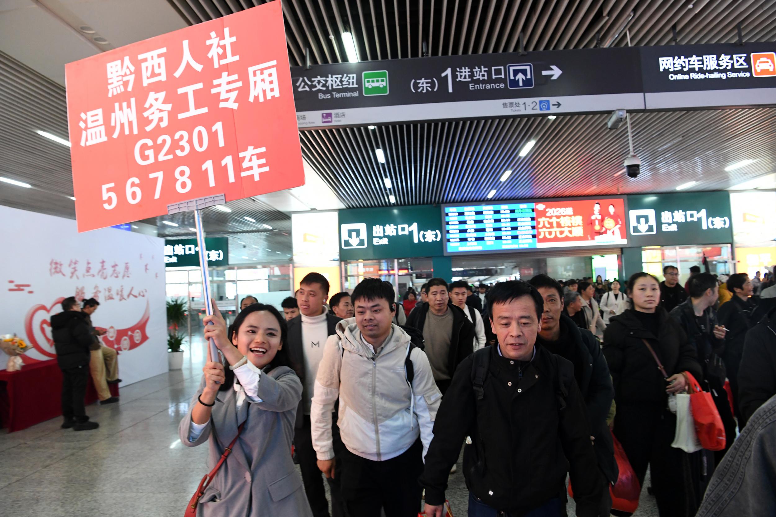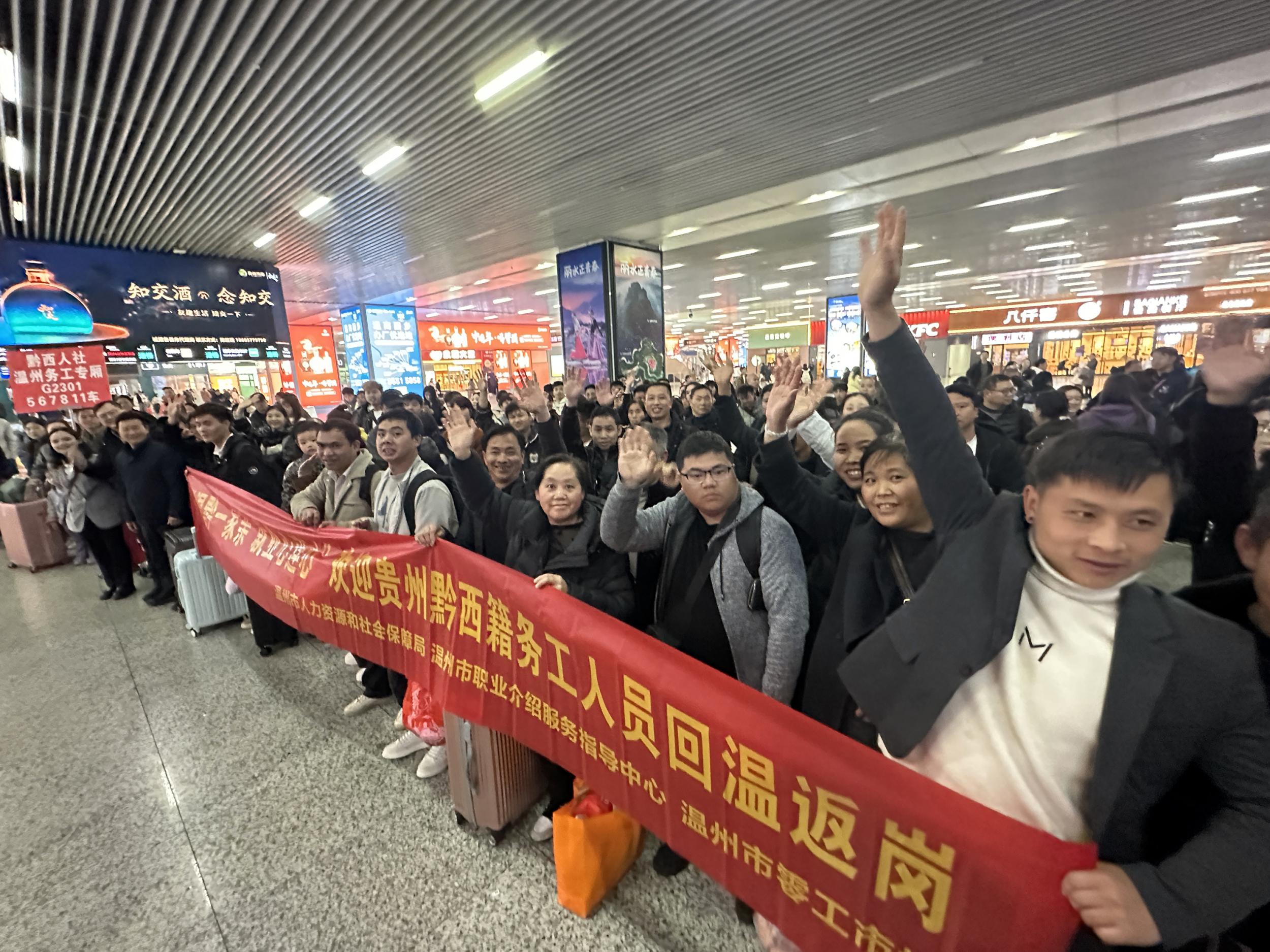 在铁路温州南站接站现场,温州市人社局联合温州市零工市场的工作人员不仅为返岗务工人员送上暖心慰问物资,还现场宣讲就业扶持政策、推介优质就业岗位、提供维权咨询指导,用贴心服务让务工人员刚抵温州便感受到家乡般的温暖。此次黔西与温州两地人社部门跨区域联动、全程护航,真正解决了外出务工人员出行难、换乘繁、就业不稳的后顾之忧,进一步深化了劳务协作实效,助力务工人员实现更高质量、更加充分的就业。