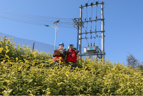 在茶园山坡上,供电员工对配电线路、开关设备及相关用电设施开展全面巡查,重点检查线路绝缘状况、接头连接情况以及变压器运行状态,及时排查因季节变化可能产生的隐患。同时,对茶园内太阳能杀虫灯的电源连接、控制箱运行状态进行检查,确保设备安全可靠运转。