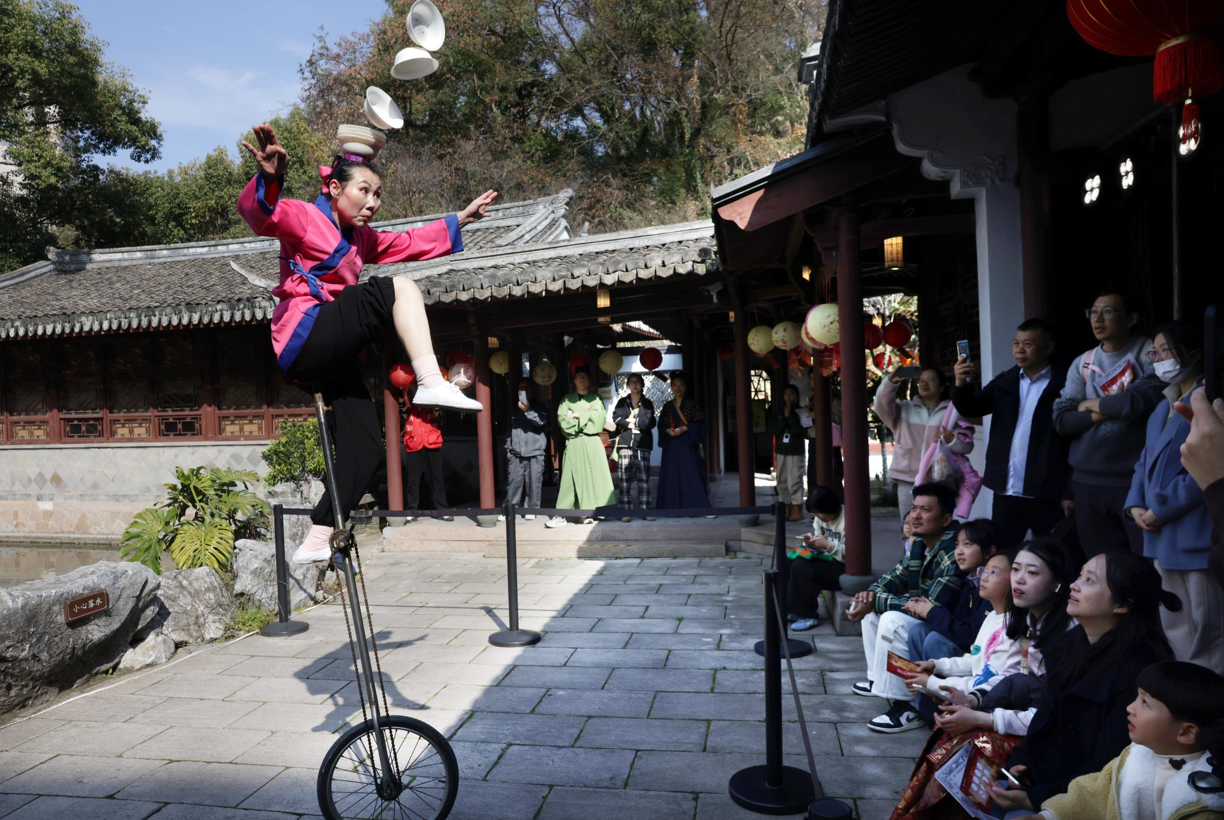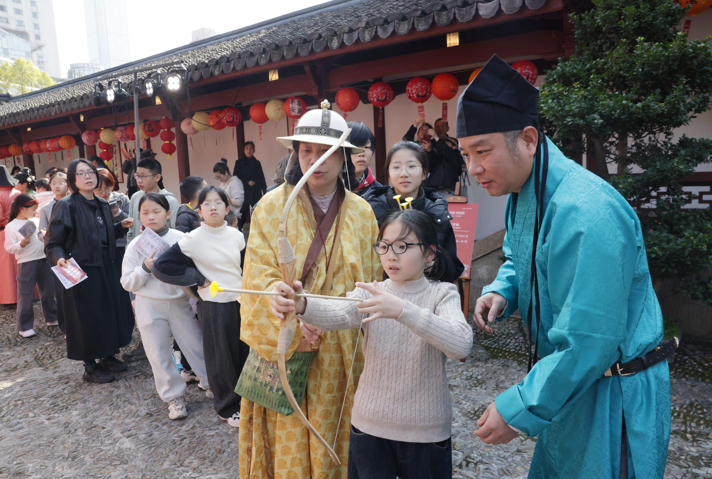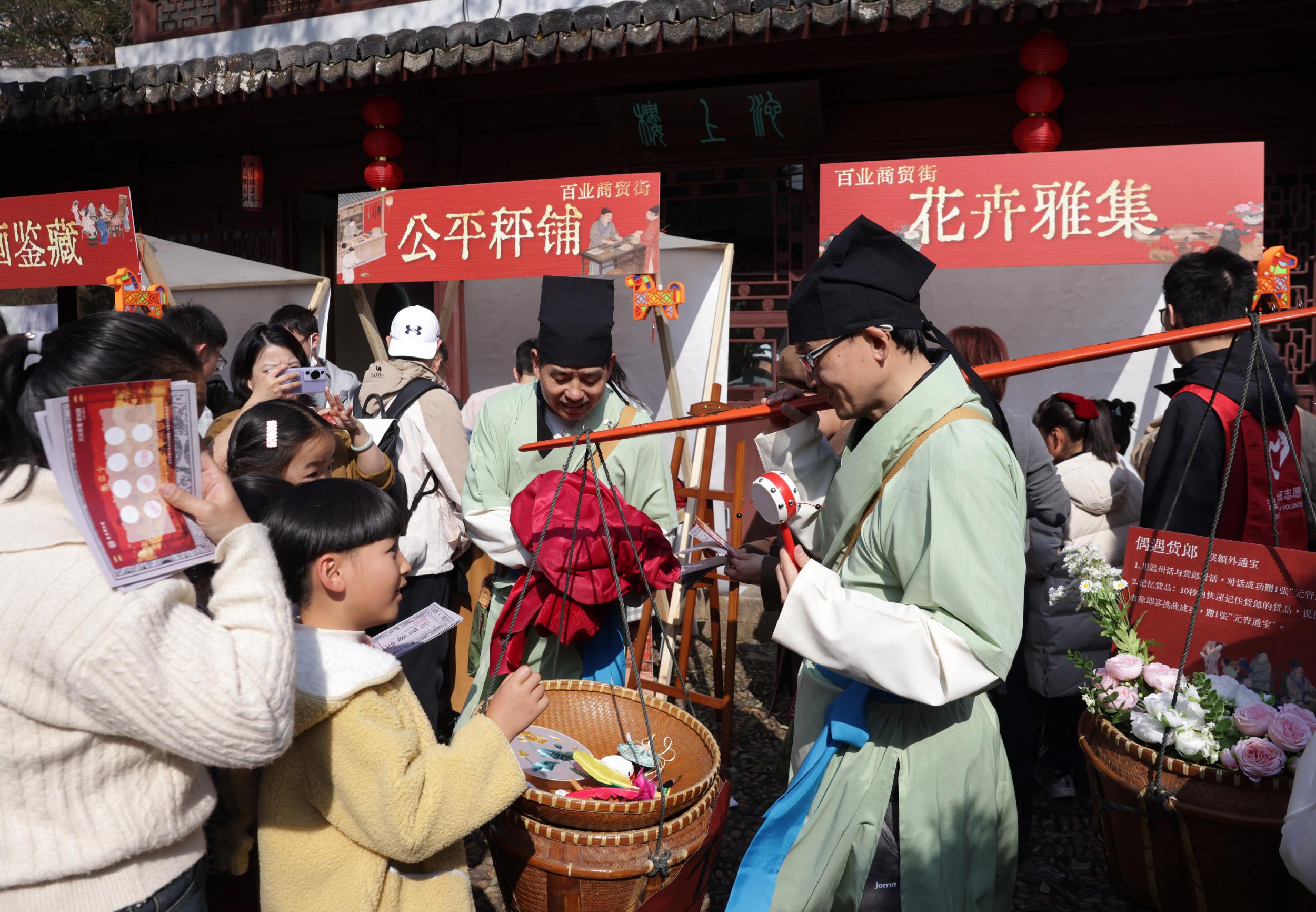 在活动现场,市民在民俗互动区里玩杂耍、在百业商贸区里逛市集、在元宵灯迷区里灯市打卡猜灯迷,亲身体验八百年前温州港市井生活的繁华场景,做一日画中客,共度别样元宵佳节。