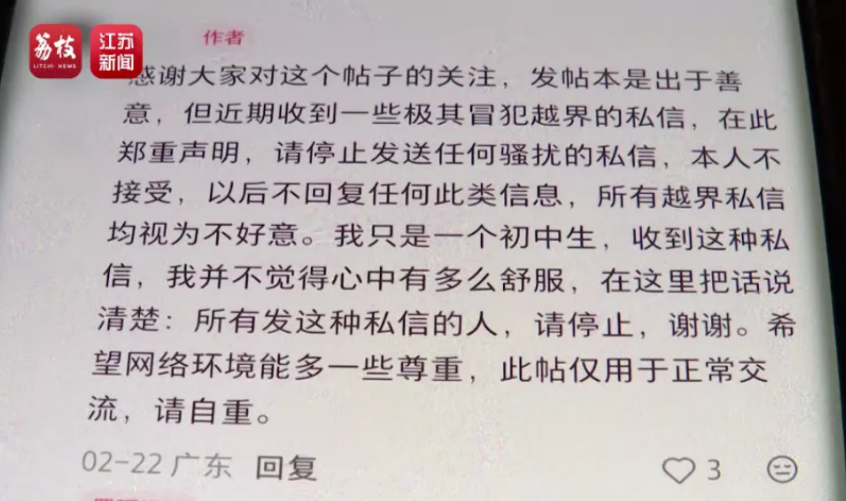 有一名标签为初一女生的用户在置顶评论中称,她发起“你问我答”互动本意是为了交友,却收到了很多不堪入目的骚扰私信。