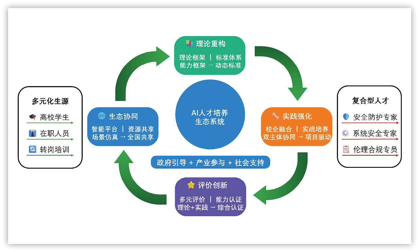 理论重构是基础,通过借鉴美国国家网络空间安全教育计划(NICE)经验,建立适合中国国情的分层分类的AI安全人才培养标准体系。